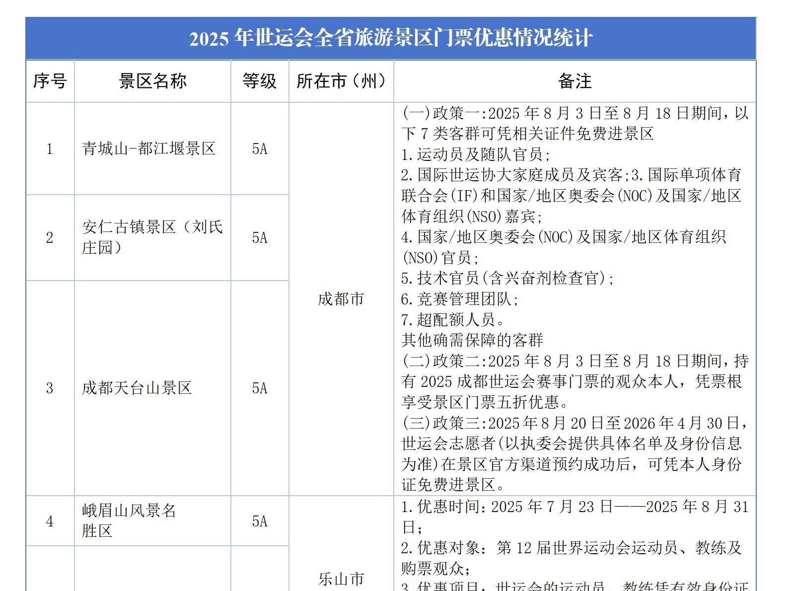 免票游四川,全省104家A級旅游景區推出世運會系列優惠政策|跟著賽事去旅行