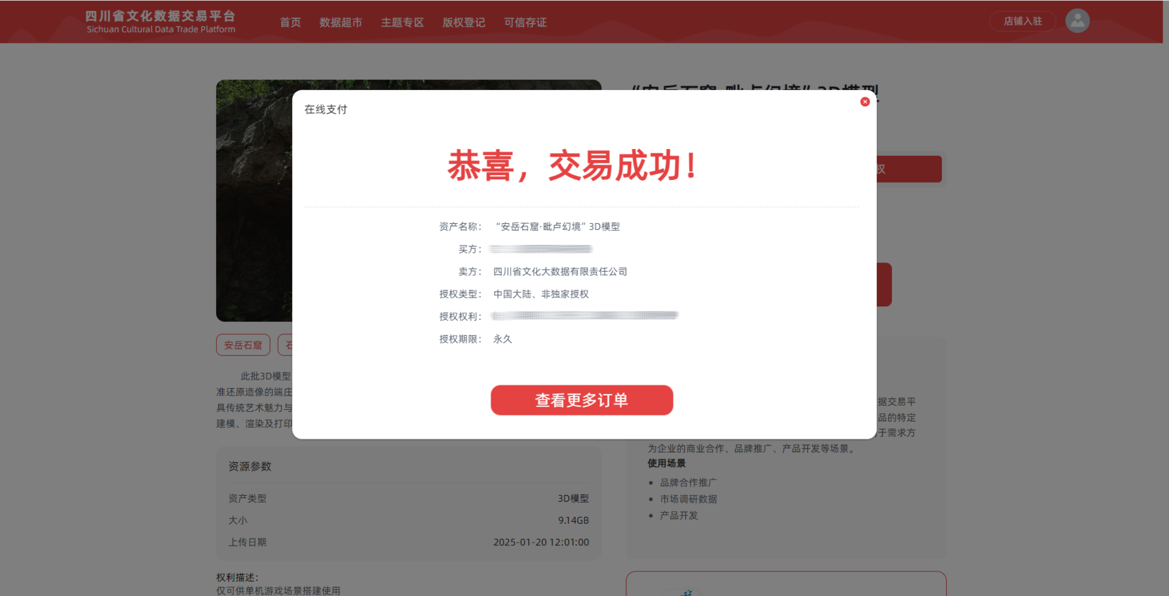 此次交易的文化數據——“安岳石窟·毗盧幻境”3D模型作品,是四川石窟文化旅游開發有限公司在獲得安岳石窟研究院授權后,對毗盧洞進行數字化采集并創作的3D模型。模型數據經三級文化數據服務平臺關聯匯入中華文化數據庫,并由四川省文化大數據公司進行代理運營。某游戲公司在四川省文化數據交易平臺上采購了此模型作品,計劃應用到游戲場景中。