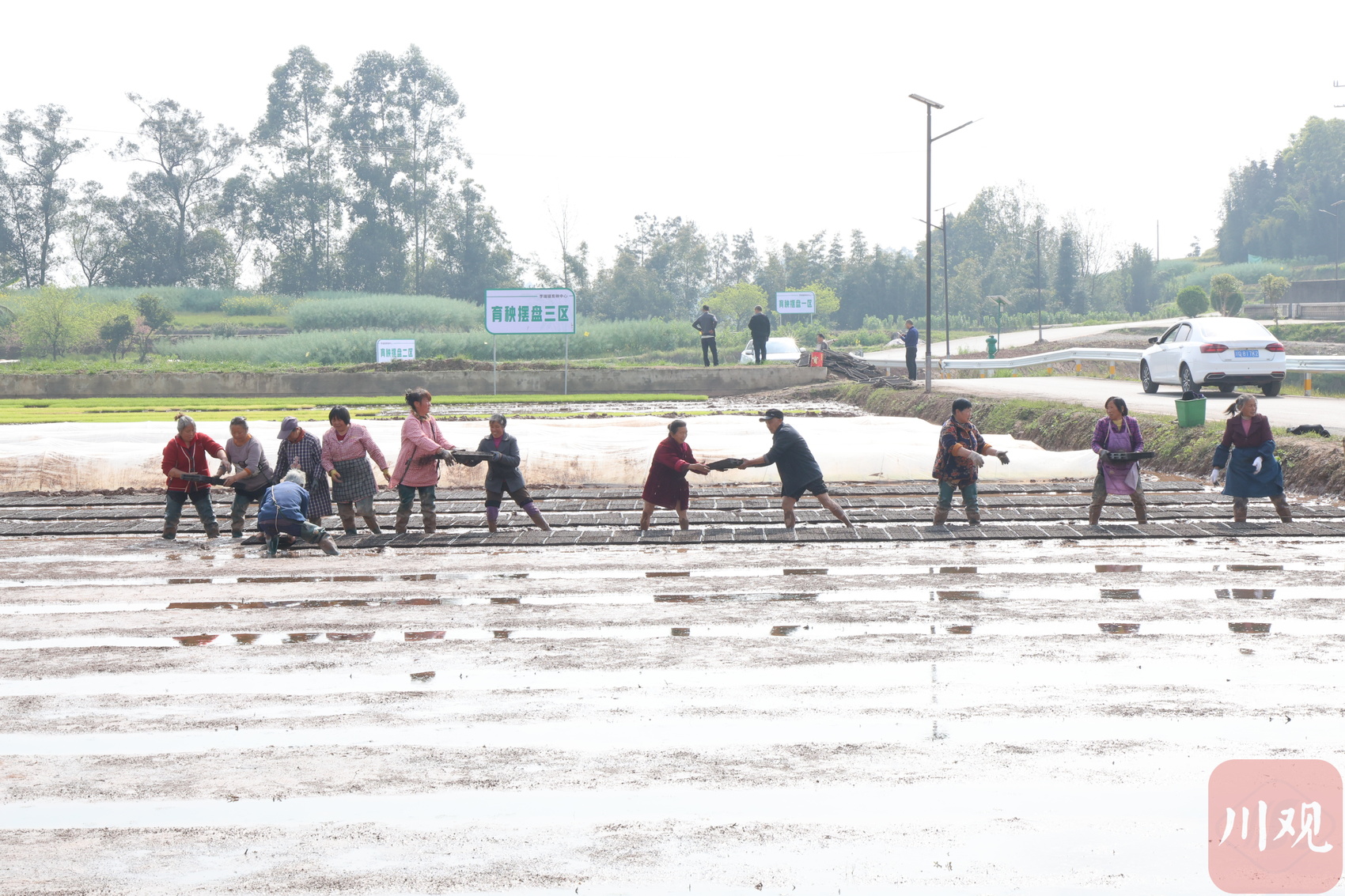 “秧好一半稻,苗壯產量高。”宜賓市翠屏區邦龍農業發展有限公司技術負責人彭介明一邊熟練地擺放秧盤一邊介紹,“擺盤時床面要干凈平整,秧盤擺放必須整齊。今天七八十畝田的擺盤半天就能完成,接著要搭棚覆膜保溫保濕,20多天后就能移栽。”彭介明說。
