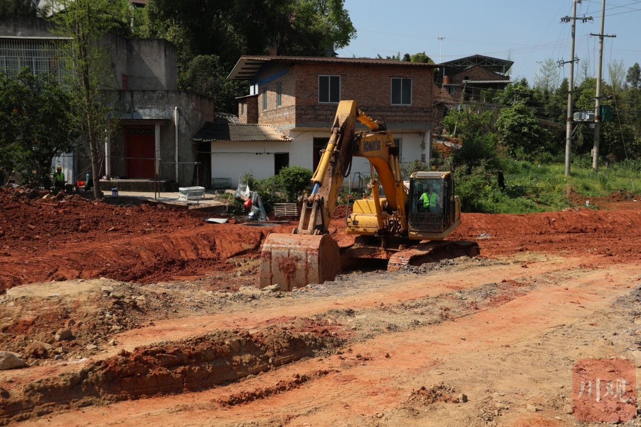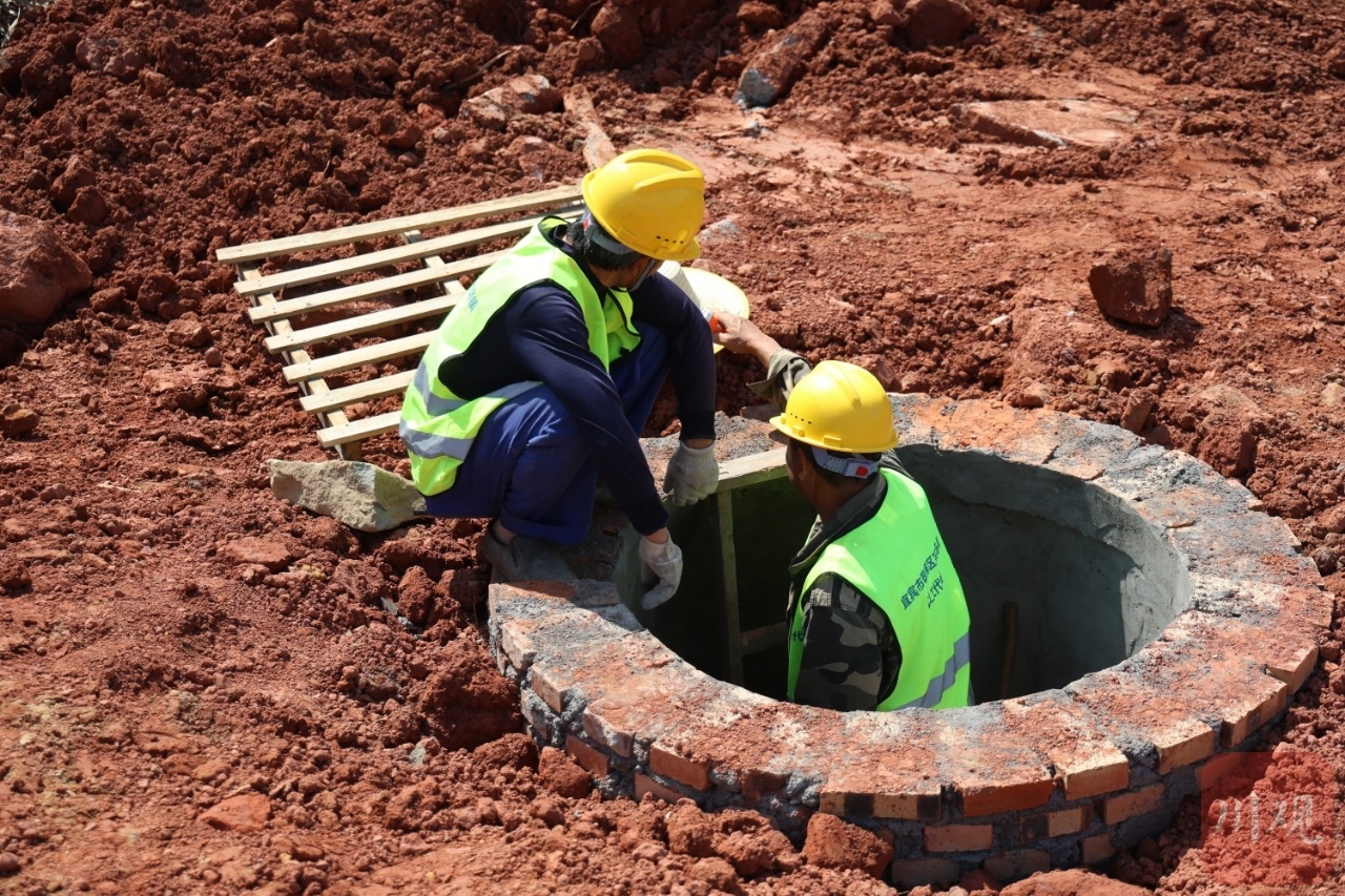 4月15日,在宜賓市翠屏區宗場鎮2025年以工代賑示范工程施工現場,挖掘機等機器不時發出轟鳴聲,由當地村民組成的施工隊正在對路邊的管網檢查井進行施工。