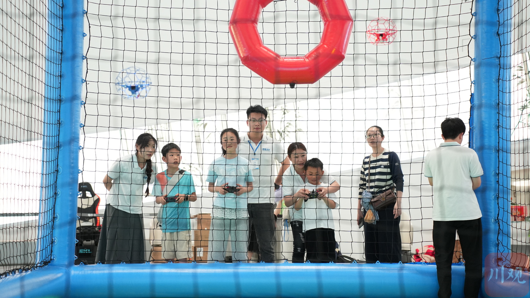 比賽現(xiàn)場(chǎng),攻門、攔截……一系列高難度動(dòng)作,讓路過(guò)的游客連聲叫好,不少小朋友們也躍躍欲試,想上手飛一圈。上六年級(jí)的劉航江第一次接觸無(wú)人機(jī),很快就上手飛了起來(lái),還和高年級(jí)的同學(xué)比試了一場(chǎng)。“操作挺困難的,但也很有意思。”他媽媽站在旁邊,拿著手機(jī)記錄下孩子初次體驗(yàn)無(wú)人機(jī)的精彩瞬間。“我本來(lái)是想帶孩子來(lái)看VR展的,沒(méi)想到孩子先在無(wú)人機(jī)足球賽上玩了起來(lái)。”