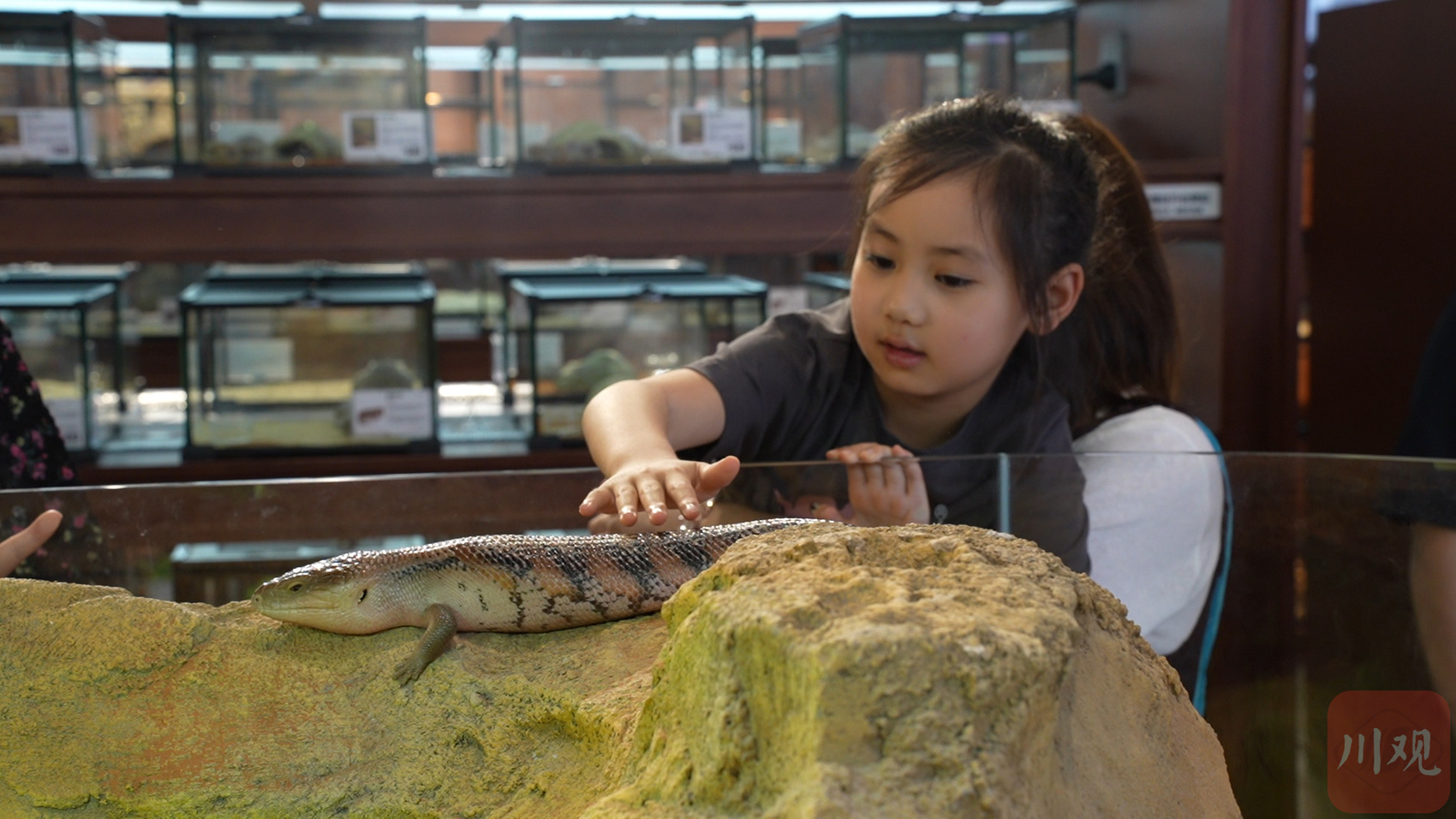 “摸起來(lái)就像是涼席,冰涼冰涼的。”9歲的羅婉琳小朋友站在展柜前,左手抱著一條藍(lán)舌石龍子。周圍的小朋友們也圍上來(lái),有些好奇、有些膽怯,伸手輕輕地?fù)崦堊印?/p>