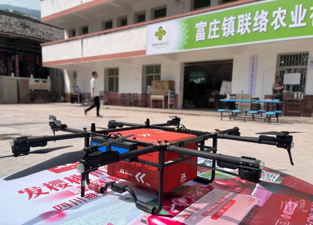 5月26日,雅安市漢源縣富莊鎮(zhèn)聯(lián)絡(luò)村,海拔1500米的山坡上,甜櫻桃林被陽光鍍上金邊。果農(nóng)白興治掀開防雨塑料膜,指尖輕觸枝頭的果實,露珠順著飽滿的果皮滾落——這個夏季,他不必再為運(yùn)輸發(fā)愁。百米外的聯(lián)絡(luò)村村民委員會廣場上,一架8軸8槳的黑色無人機(jī)正展開螺旋槳,準(zhǔn)備進(jìn)行試飛。