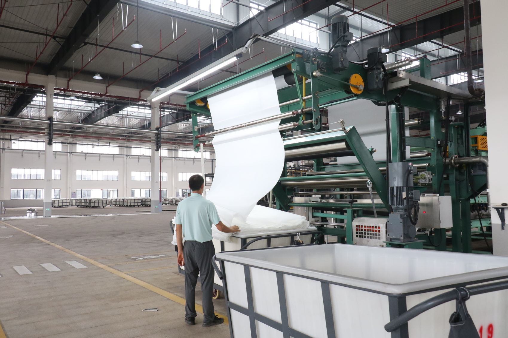 “重點工作主要是在設備調試生產過程中,把整個生產環節全部打通,包括OS精煉前處理、染色、水洗烘干、定型防水到壓光涂層。之后把產品展示出來,讓更多人看到,得到市場認可。”三豐數智總經理熊小勇介紹,試生產階段進展順利,預計6月底正式投產。