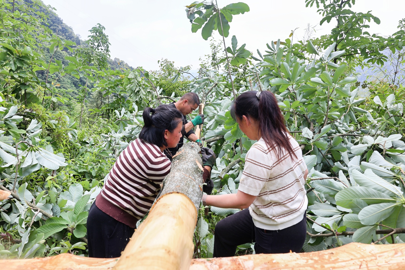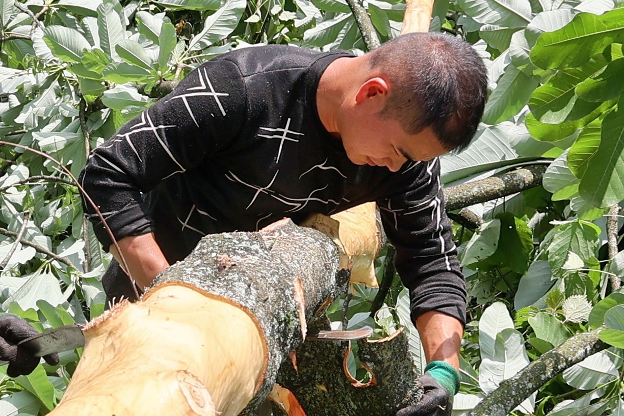 “突突突……”沈重成操起割樹機(jī),將一棵30年樹齡的厚樸樹鋸倒。