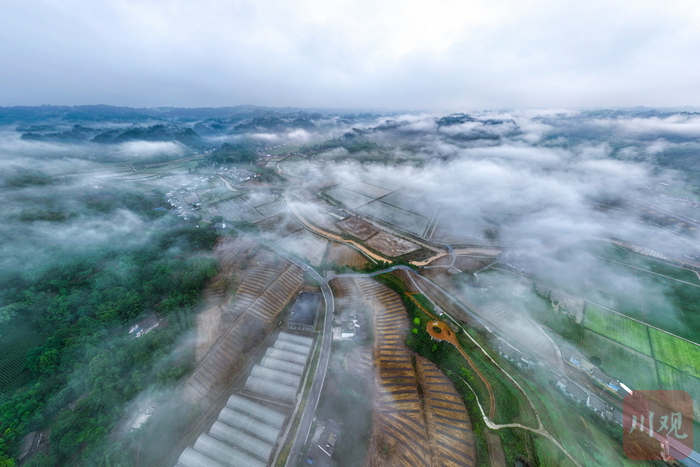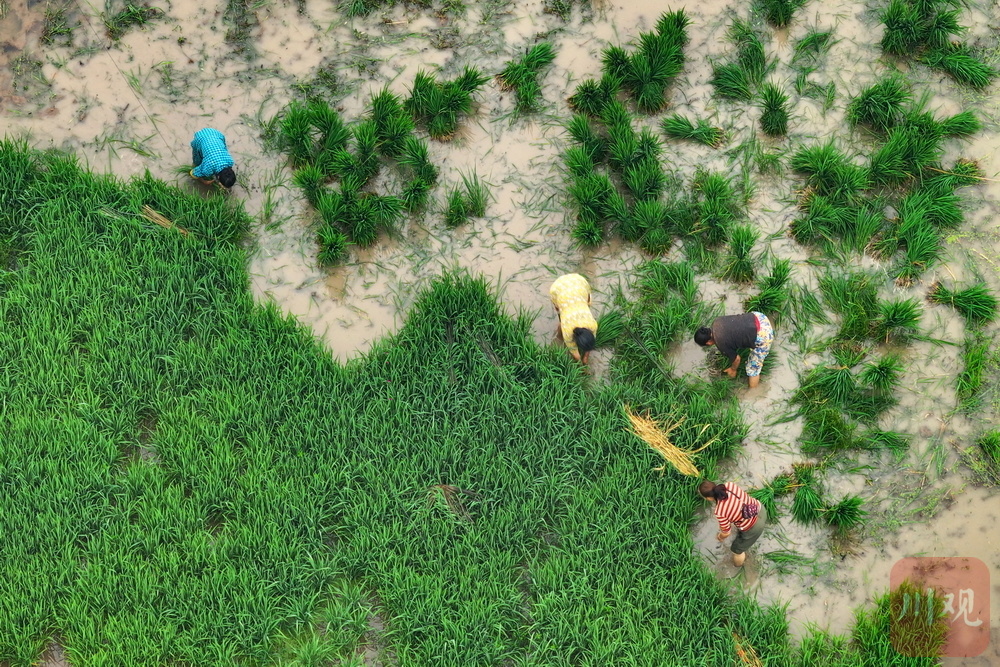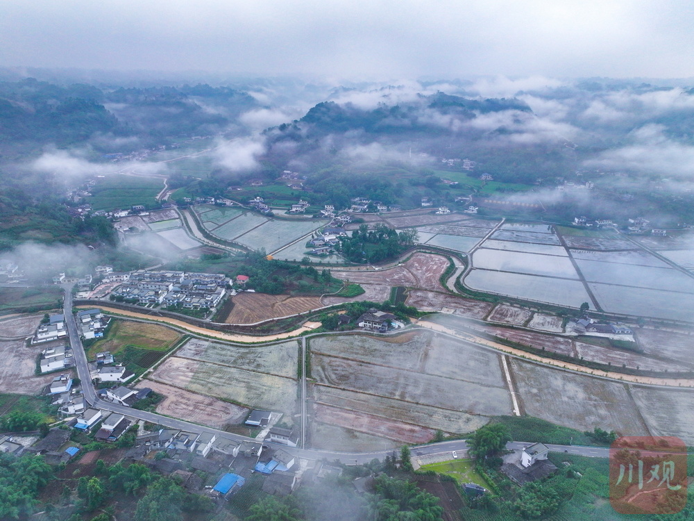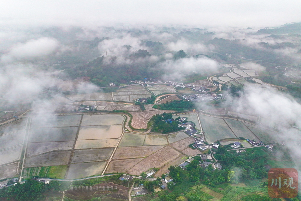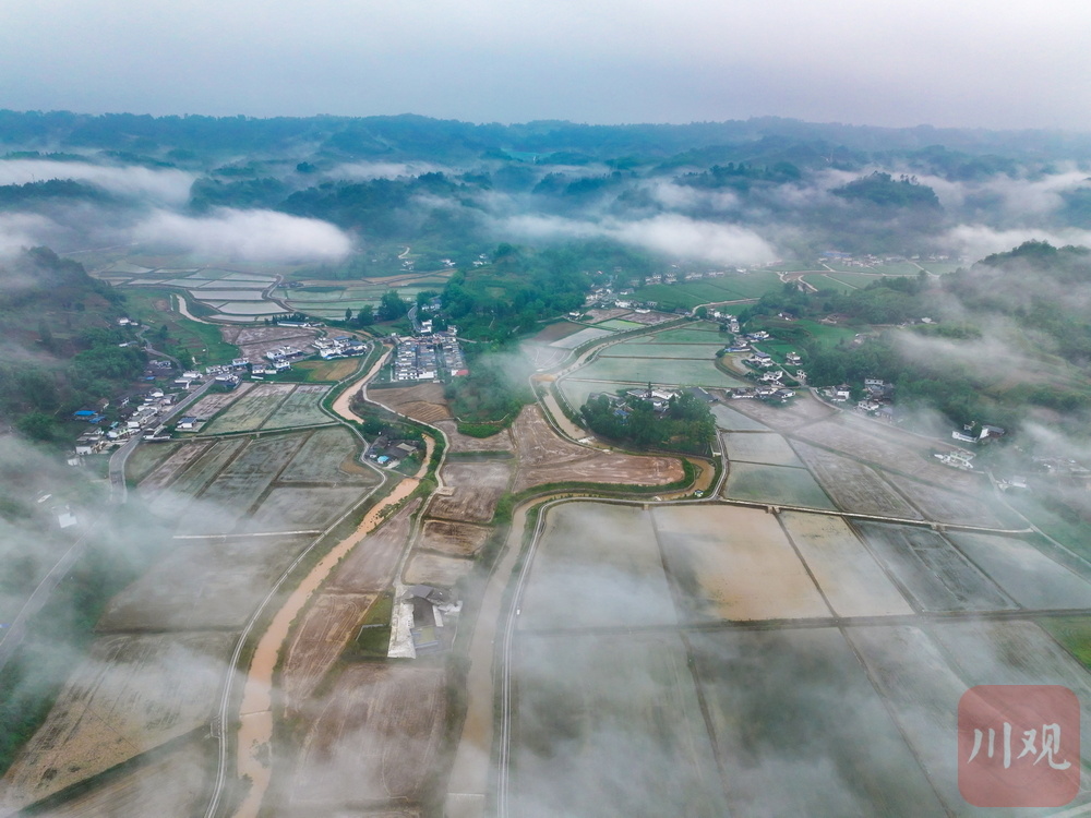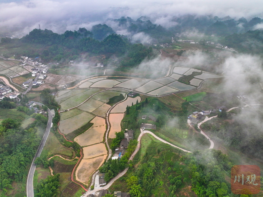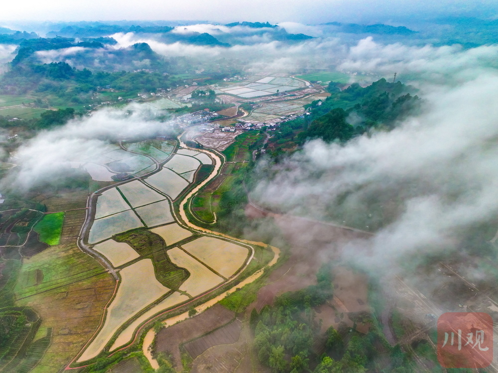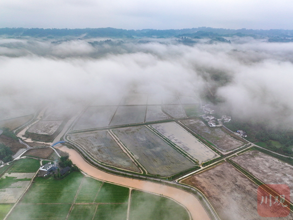 6月24日清晨,雨后的雅安市名山區糧油現代農業園區云遮霧繞,尚未完成插秧的稻田泛出多種色彩,與青山、茶園、村莊、河流等相映成趣,構成了一幅幅唯美的水墨畫卷。