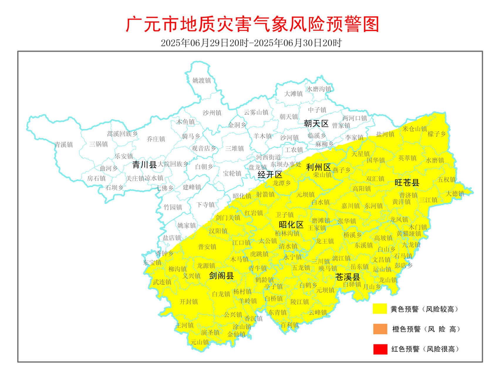 根據(jù)氣象部門天氣預報情況,結合地質環(huán)境條件,經(jīng)會商研判,廣元市地質災害防治指揮部辦公室發(fā)布地質災害氣象風險預警(黃色),涉及6個縣(區(qū))100個鄉(xiāng)鎮(zhèn)。6月29日20時至6月30日20時,廣元市地質災害氣象風險預警預報( 三級(黃色預警,風險較高)結果如下:蒼溪縣、旺蒼縣、劍閣縣、昭化區(qū)全境;利州區(qū):龍?zhí)多l(xiāng)、東壩辦事處、榮山鎮(zhèn)、大石鎮(zhèn);朝天區(qū):李家鎮(zhèn)。