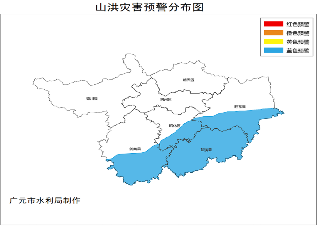 同一時間,廣元市水利局、廣元市氣象局發(fā)布山洪災害預警(藍色),6月29日20時至30日20時,蒼溪縣全境,旺蒼縣白水鎮(zhèn)、高陽鎮(zhèn)、雙匯鎮(zhèn)、五權鎮(zhèn)、普濟鎮(zhèn)、大德鎮(zhèn)、三江鎮(zhèn)、黃洋鎮(zhèn)、東河鎮(zhèn)、嘉川鎮(zhèn)、張華鎮(zhèn)、龍鳳鎮(zhèn)、木門鎮(zhèn)、九龍鎮(zhèn),劍閣縣木馬鎮(zhèn),開封鎮(zhèn)、白龍鎮(zhèn)、楊村鎮(zhèn)、羊嶺鎮(zhèn)、鶴嶺鎮(zhèn)、公興鎮(zhèn)、香沉鎮(zhèn)、王河鎮(zhèn)、演圣鎮(zhèn)、涂山鎮(zhèn)、元山鎮(zhèn)、金仙鎮(zhèn),昭化區(qū)虎跳鎮(zhèn)、太公鎮(zhèn)、柏林溝鎮(zhèn)、王家鎮(zhèn)、磨灘鎮(zhèn)、清水鎮(zhèn)、青牛鎮(zhèn)可能發(fā)生山洪災害(藍色)。