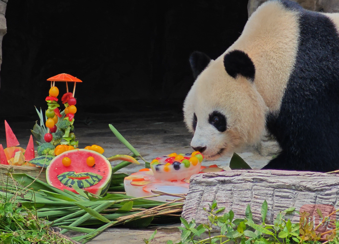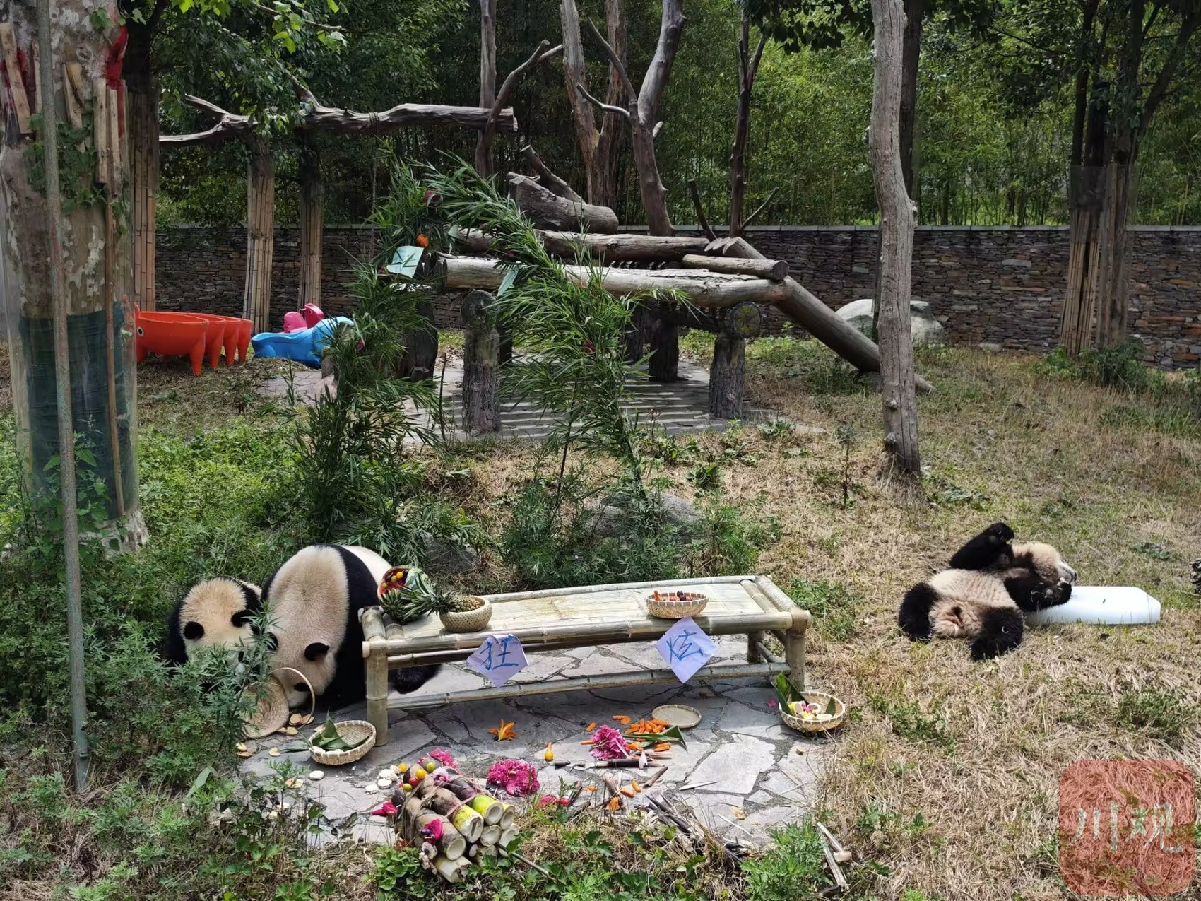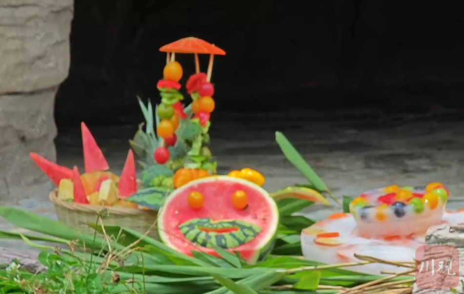 飼養員們為近期過生日的大熊貓們準備了西瓜、冰蛋糕等食物豐容。