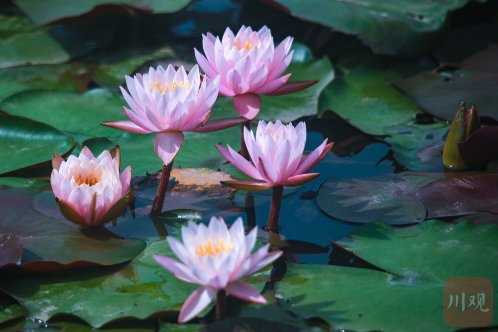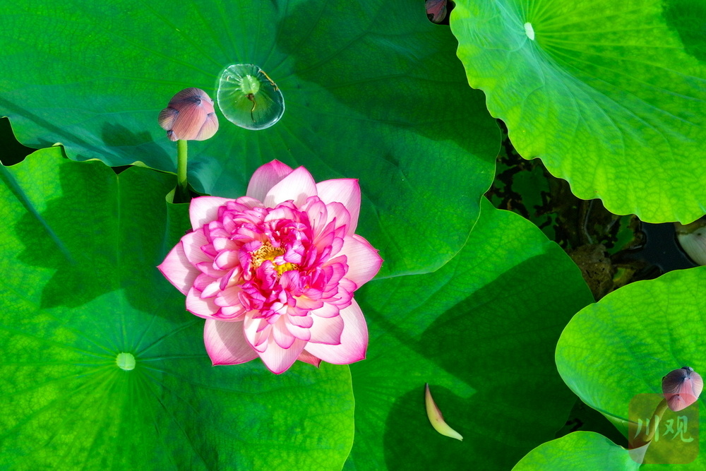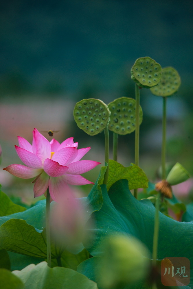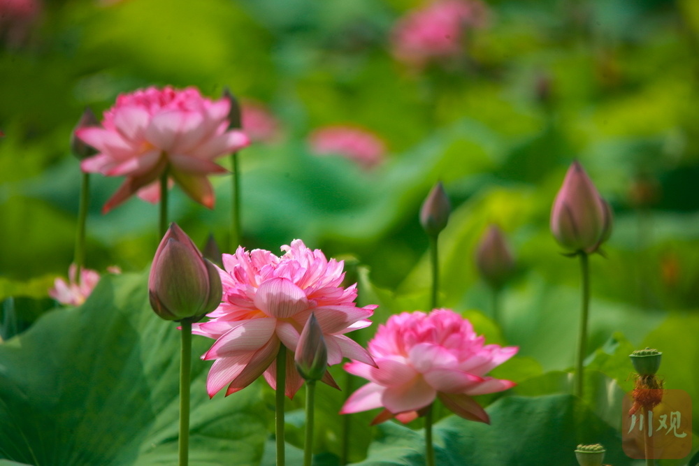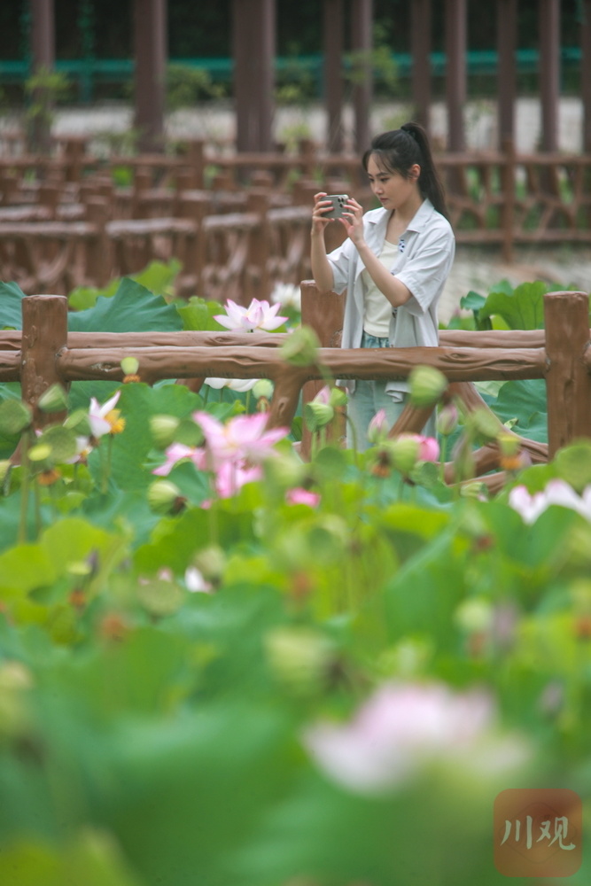 另一邊,“淡妝”荷花以低飽和度的粉白配色詮釋極簡美學(xué),兩種截然不同的視覺語言共同書寫出今夏最美配色教科書。