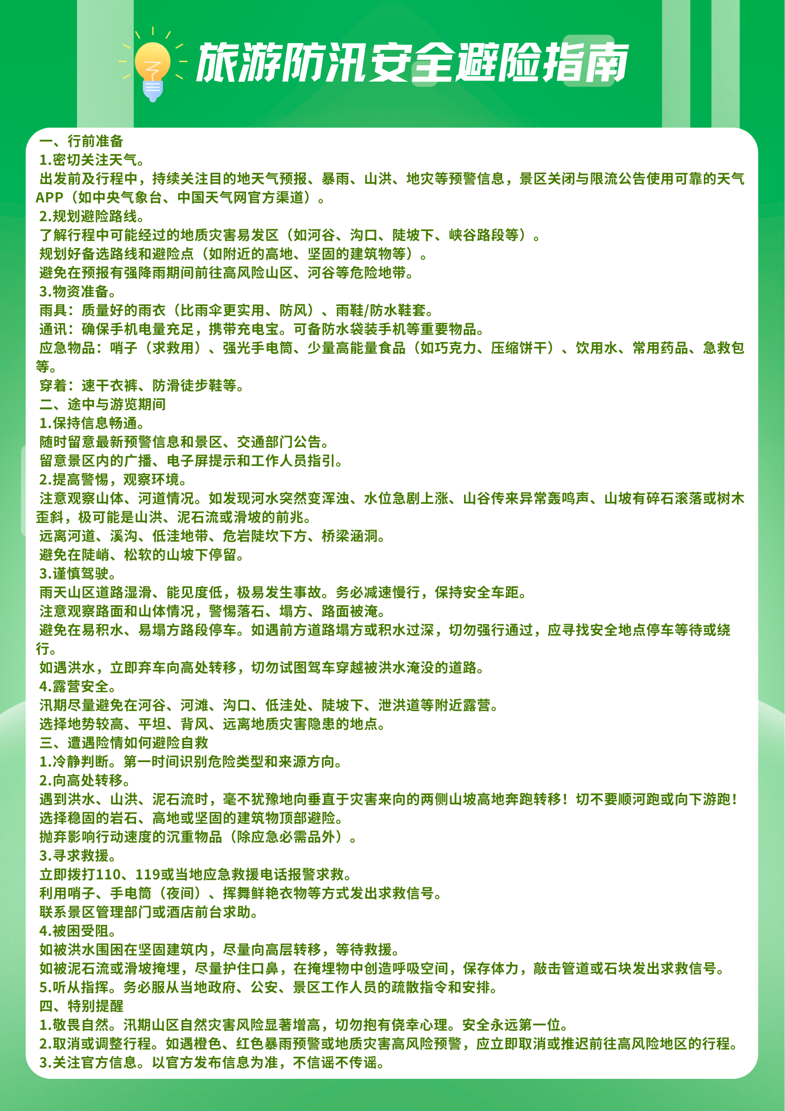 針對(duì)汛期安全需謹(jǐn)記,避險(xiǎn)防災(zāi)莫大意。汛期旅游,應(yīng)密切關(guān)注目的地及沿途天氣預(yù)報(bào)、地質(zhì)災(zāi)害預(yù)警和旅游景區(qū)公告信息,避免在暴雨天前往河谷、低洼地帶、陡峭邊坡、地質(zhì)災(zāi)害高風(fēng)險(xiǎn)區(qū)域。遇雷雨天氣,不在樹下、山頂、空曠地帶停留,遠(yuǎn)離金屬物體。自駕游客需特別注意山區(qū)道路濕滑、落石風(fēng)險(xiǎn),暴雨條件下謹(jǐn)慎進(jìn)入隧道和地下空間。遭遇險(xiǎn)情,應(yīng)保持冷靜,迅速向安全區(qū)域轉(zhuǎn)移,聽從現(xiàn)場(chǎng)工作人員指揮。