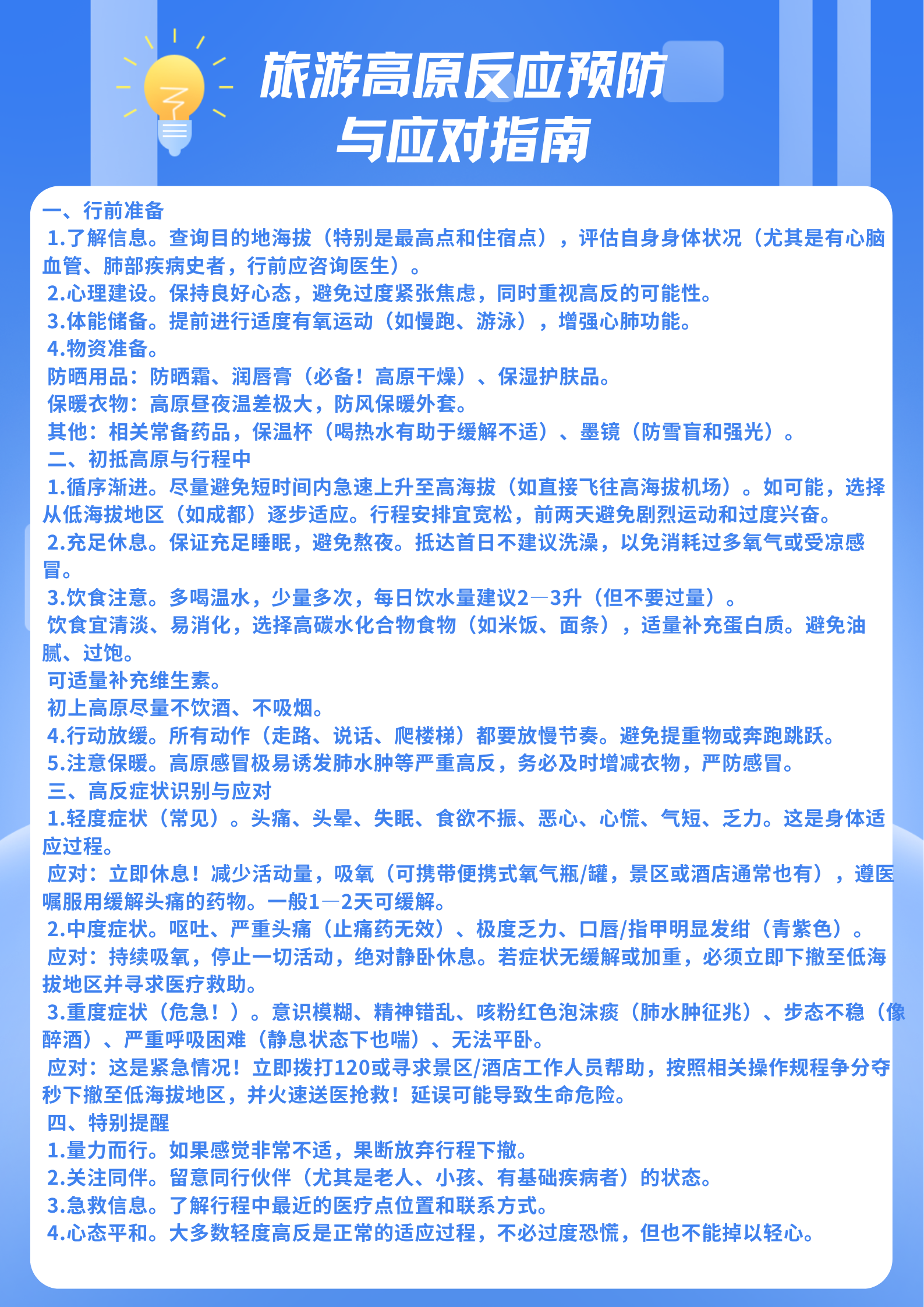 針對(duì)高原反應(yīng)早預(yù)防,量力而行保平安。前往高海拔地區(qū)和景區(qū)旅游,提前了解目的地海拔,做好防高反準(zhǔn)備。初抵高原避免劇烈活動(dòng),注意休息,保證充足睡眠,適量飲水,必要時(shí)可遵醫(yī)囑提前服用預(yù)防藥物。行程安排量力而行,循序漸進(jìn)適應(yīng)高海拔,出現(xiàn)頭痛胸痛、呼吸困難等不適,應(yīng)立即下撤至低海拔地區(qū)并就醫(yī);若嚴(yán)重不適,應(yīng)立即尋求醫(yī)療救助。老人、兒童、孕婦及患有心腦血管、呼吸系統(tǒng)疾病的旅游者需格外謹(jǐn)慎前往。
