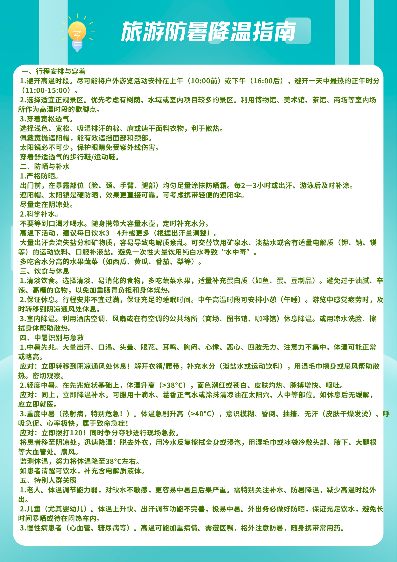 針對(duì)高溫烈日防中暑,清涼舒適享旅程。高溫天氣下出游,提前備好遮陽帽、太陽鏡、防曬霜、藿香正氣液、風(fēng)油精等常用物品藥品,穿著寬松、透氣、吸汗的淺色衣物。合理安排戶外活動(dòng)時(shí)間,盡量避開正午高溫時(shí)段。務(wù)必?cái)y帶足量飲用水,少量多次補(bǔ)充水分,可適量補(bǔ)充含鹽分和礦物質(zhì)的飲品。特別關(guān)注老人、兒童及體質(zhì)較弱者,如出現(xiàn)頭暈、惡心、乏力等中暑癥狀,應(yīng)立即到陰涼通風(fēng)處休息降溫,必要時(shí)及時(shí)就醫(yī)。