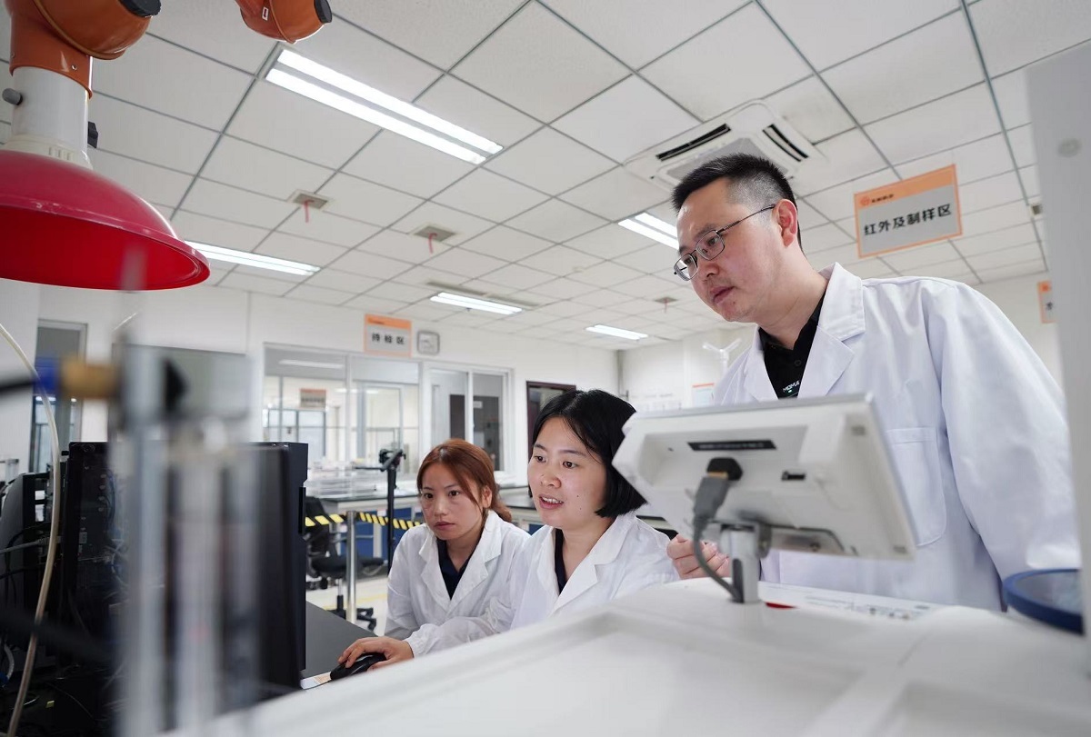 周友(右一)與同事一起做材料檢測(郭超英攝)