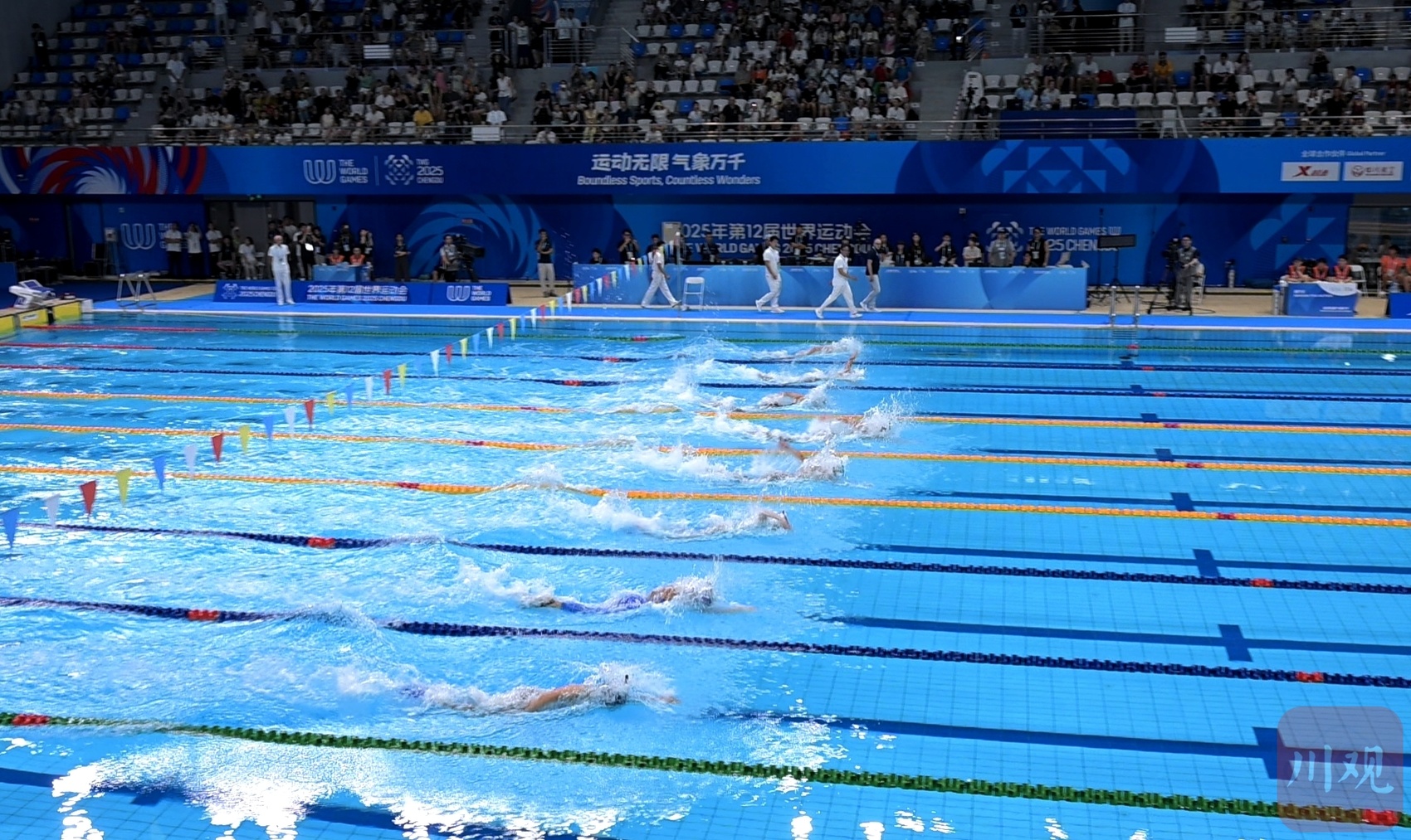館內(nèi)燈光熄滅,水面恢復(fù)平靜。8月11日晚,成都世運(yùn)會成都體育學(xué)院游泳館完成全部比賽項目。