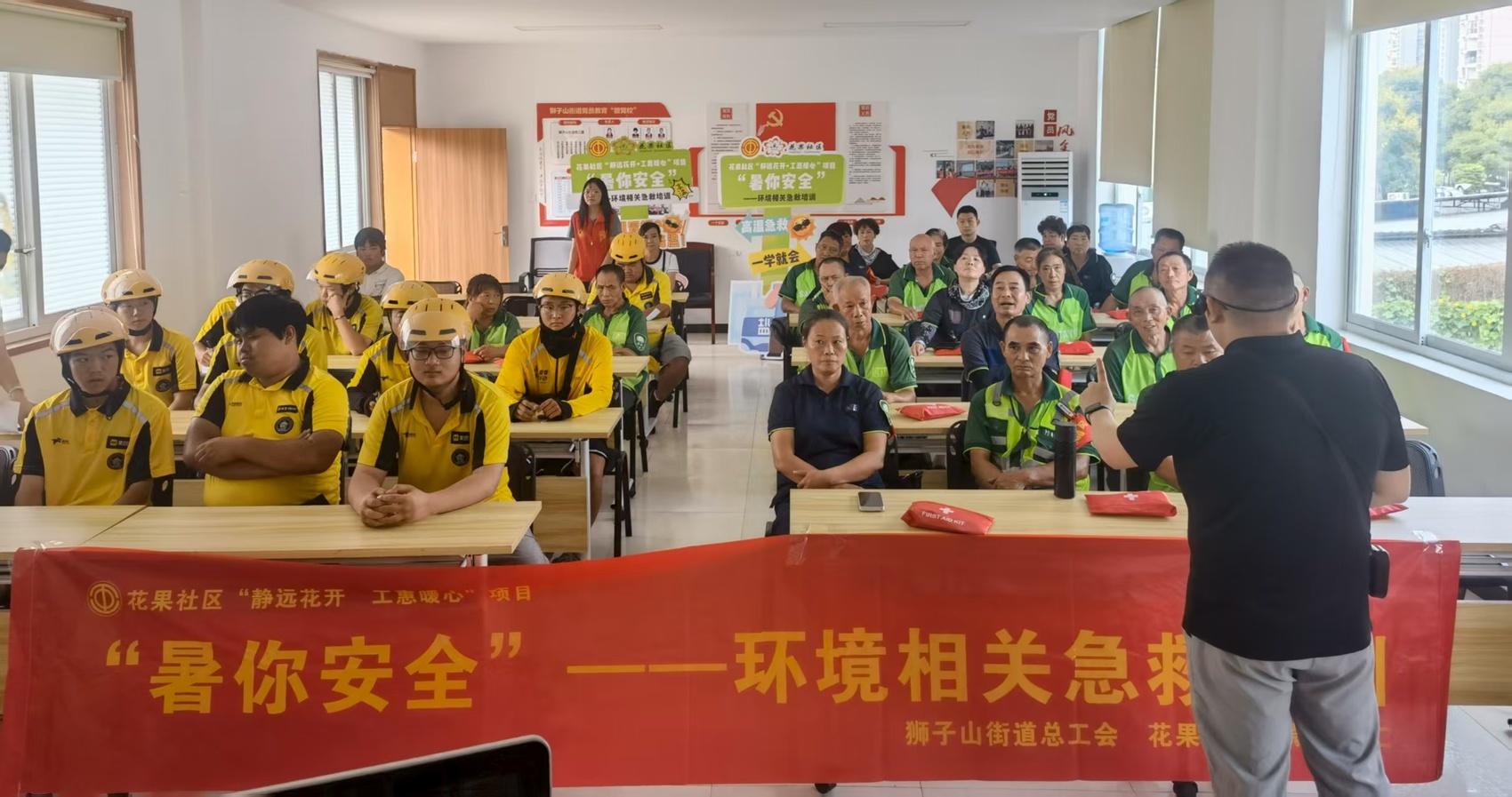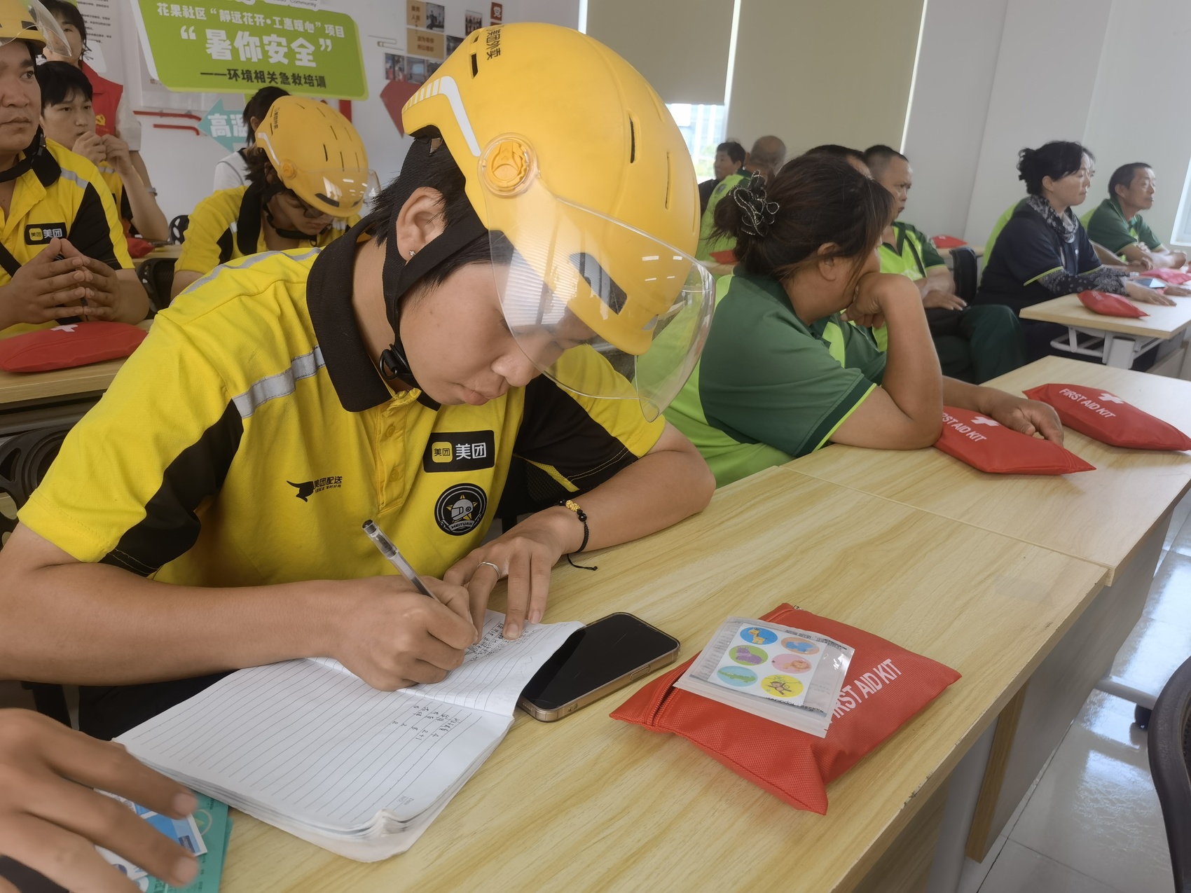 8月15日上午,成都市錦江區獅子山街道花果社區三樓會議室內,一場特殊的高溫急救培訓正在進行。50余名外賣騎手、環衛工人坐在一起,聆聽社會工作師岳雙平講授應對突發中暑急救的相關知識。據悉,這是由錦江區總工會、獅子山街道黨工委、獅子山街道總工會指導,花果社區聯合微希社工開展的“暑你安全”高溫急救專項培訓,旨在為高溫下的戶外勞動者構建職業健康安全防護網。