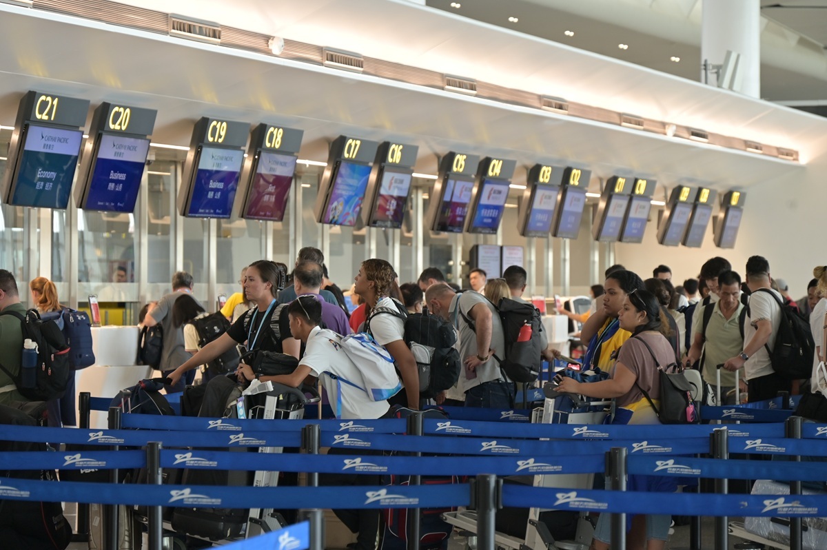 8月18日,外國(guó)旅客在成都天府國(guó)際機(jī)場(chǎng)辦理登機(jī)手續(xù),等待出境。何海洋 攝(資料圖片)