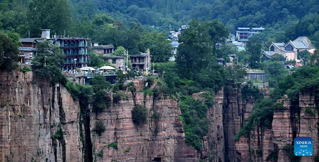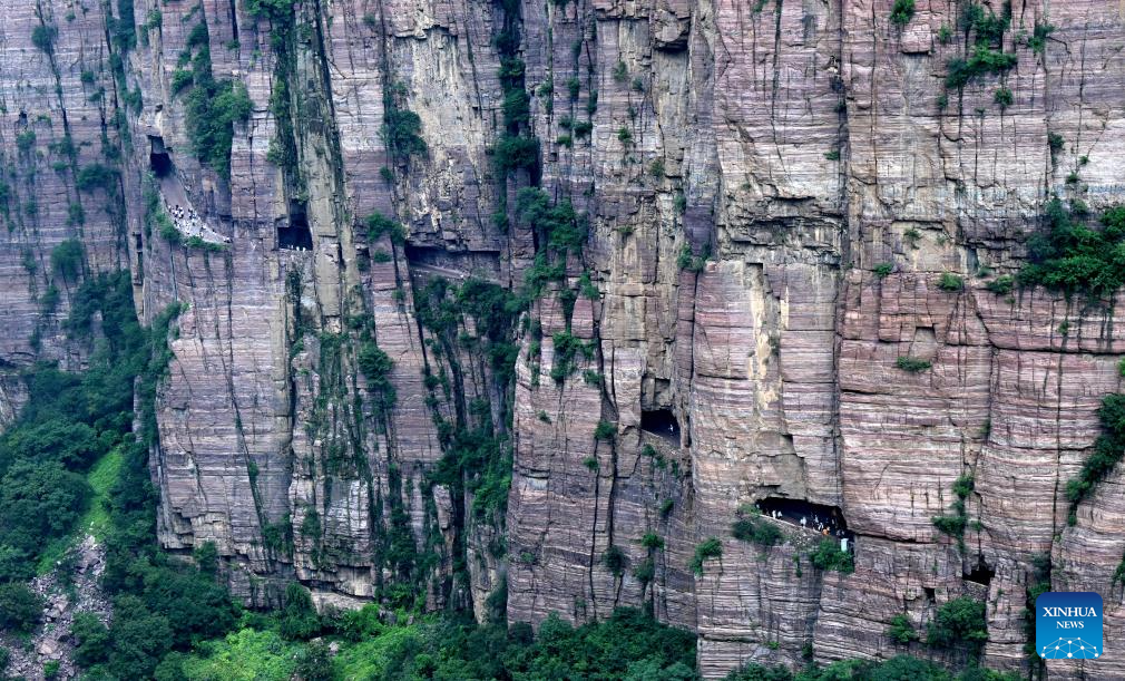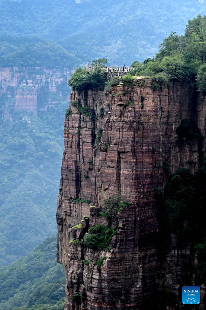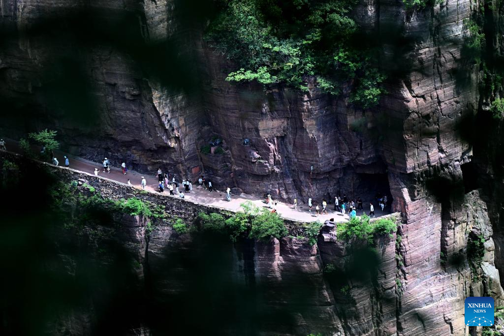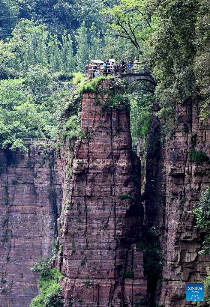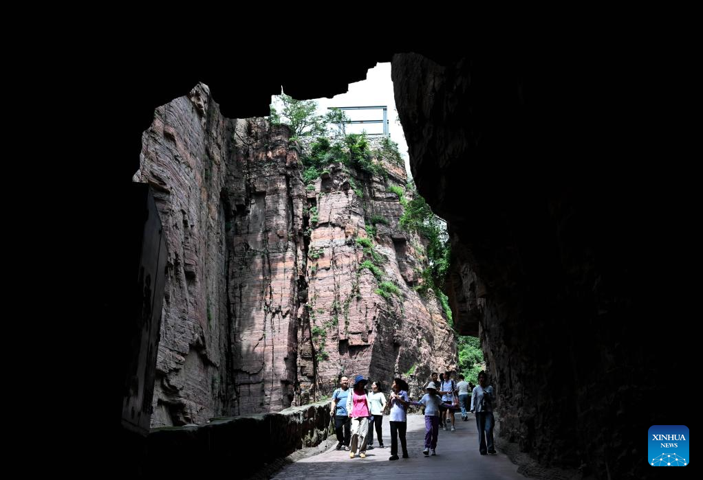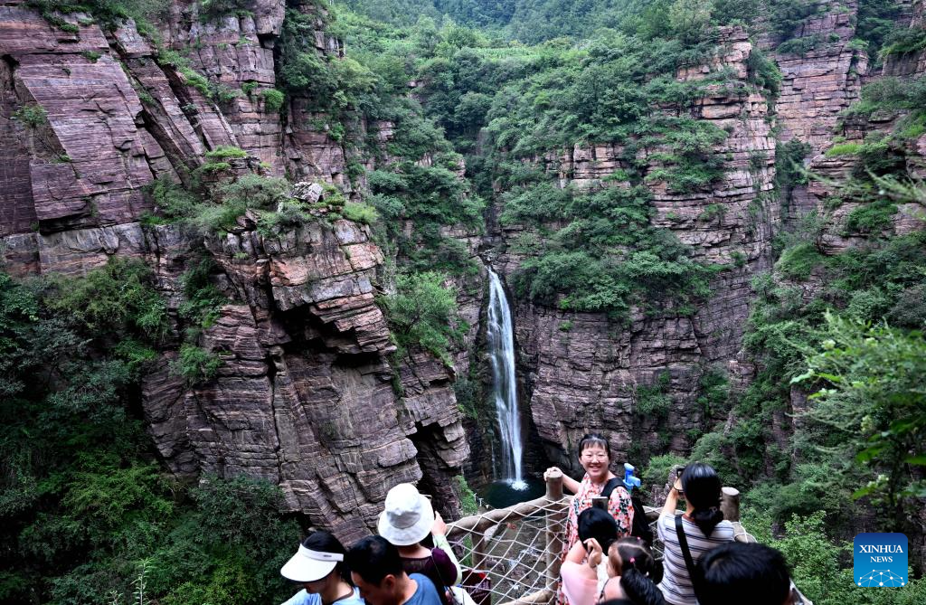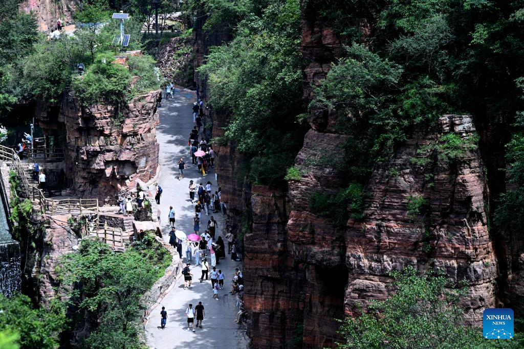 Tourists visit the Wanxianshan scenic area in Huixian City, central China's Henan Province, Aug. 16, 2025. The Wanxianshan scenic area, located deep in the Taihang Mountains and boasting its geological characters, attracts a lot of tourists in summer. (Xinhua/Zhu Xiang)