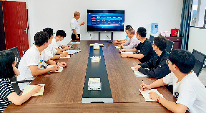 西南科技大學(xué)李晶教授團(tuán)隊(duì)針對綠鑫電源中試線運(yùn)行情況進(jìn)行討論。供圖/遂寧組
