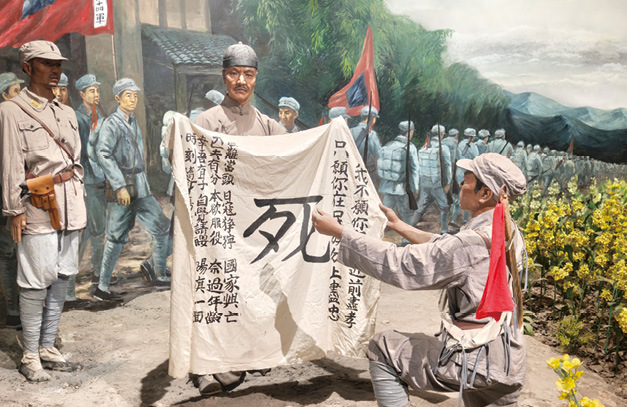 8月,位于成都大邑縣安仁鎮的建川博物館里,游人如織。在“死字旗”文物展區前,參觀者紛紛駐足——復原的場景中,身著軍裝的戰士單膝跪地,雙手鄭重接過一面書寫著“死”字的旗幟。伴隨著講解員的聲音,一段穿越八十余年的故事徐徐展開……
