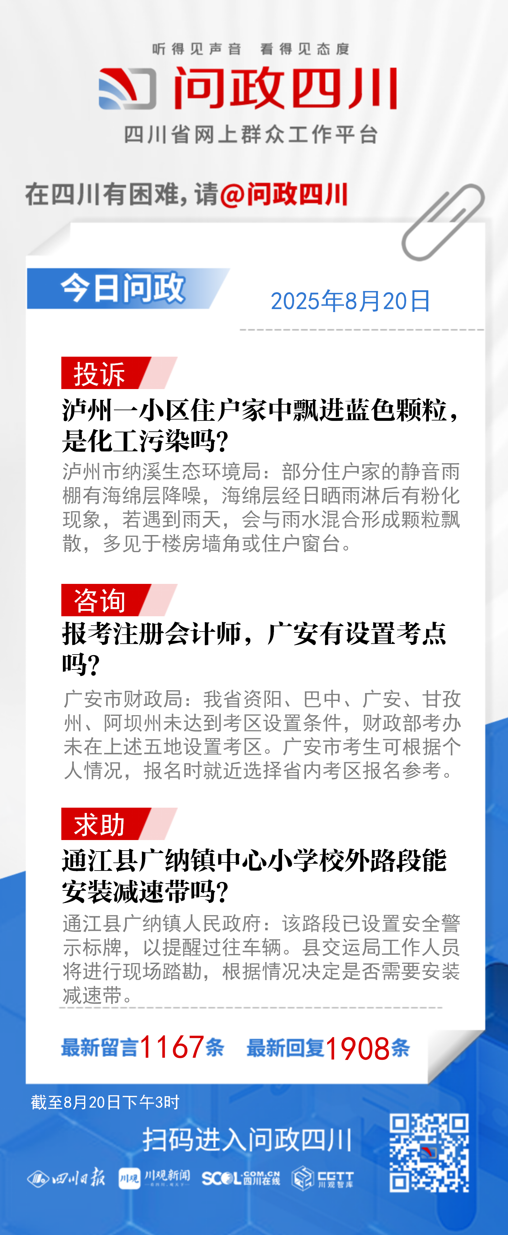 在四川有困難,找問政四川。如果您在四川遇到了操心事、煩心事、揪心事,請登錄“四川省網上群眾工作平臺—問政四川”或撥打問政四川熱線(028-96001)留言反映、求助或建議。我們將充分發揮平臺的互動聯系作用及輿論監督功能,第一時間傳遞民聲,推動問題得以及時解決——聽得見聲音,看得見態度。