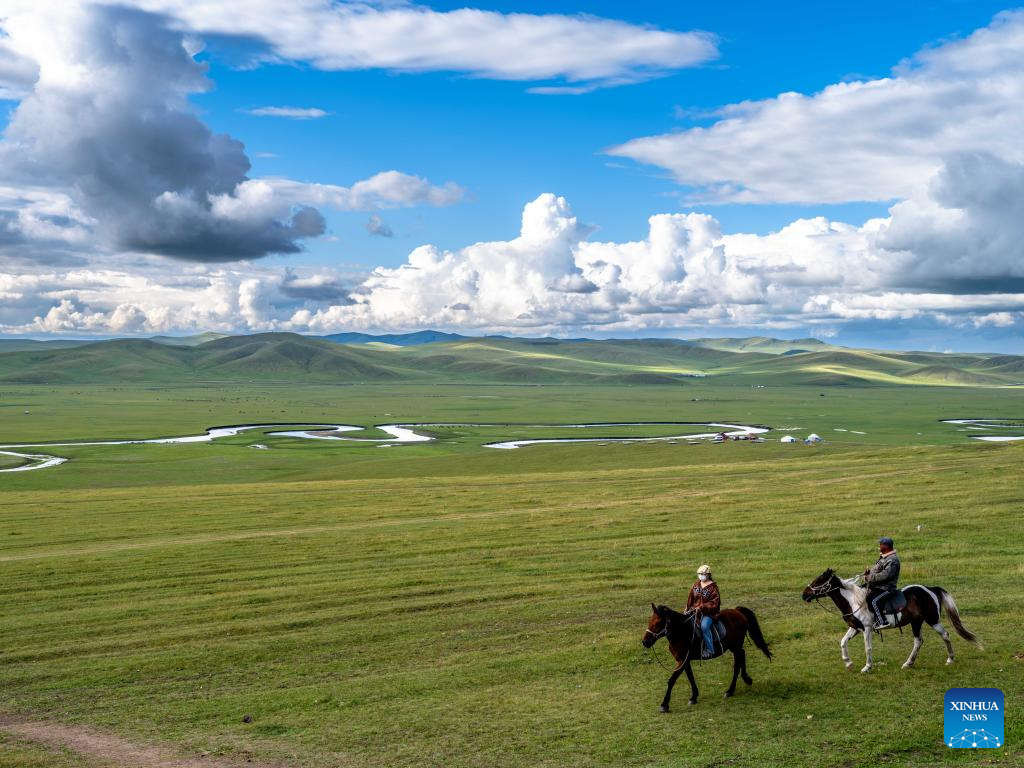 People ride horses near the Mergel Gol River in Hulun Buir, north China's Inner Mongolia Autonomous Region on Aug. 19, 2025. (Xinhua/Ma Jinrui)