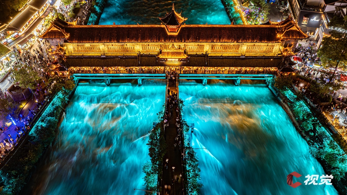 國慶假期,都江堰市游人如織。夜晚,天府源廊橋上滿是前來觀看“藍眼淚”的游人。C視覺簽約攝影師 徐浩倫 攝