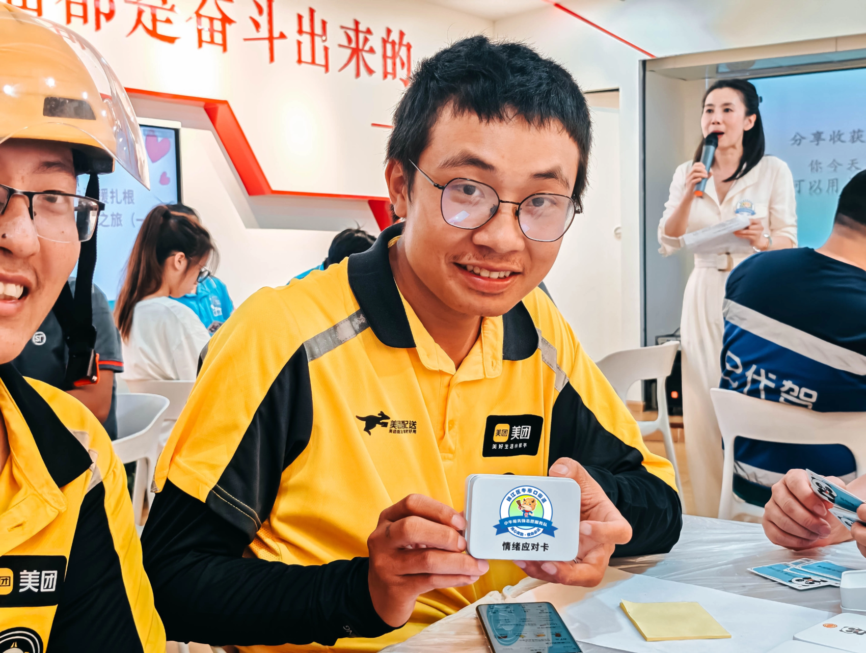 活動(dòng)現(xiàn)場,工作人員還為大家送上了精心準(zhǔn)備的心理小禮包,里面裝著設(shè)計(jì)貼心的情緒應(yīng)對卡:卡片上針對訂單超時(shí)的焦慮、路途中的煩躁、與顧客溝通的困擾等常見場景,一一標(biāo)注了簡單實(shí)用的情緒調(diào)節(jié)方法,讓小哥們無論身處何種環(huán)境、面臨何種心境,都能快速找到恰當(dāng)?shù)慕鉀Q辦法。