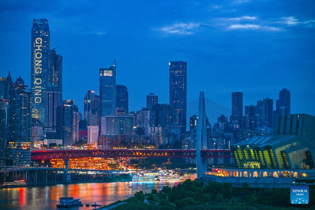 This photo shows the city view at dusk in southwest China's Chongqing Municipality, Aug. 23, 2025. Under the night sky, Chongqing is ablaze with lights and full of charm. Since April 19 this year, in the evenings of every Saturday and important holidays, Chongqing has staged regular performances of drone light show to further boost the city's night economy. (Xinhua/Wang Quanchao)
