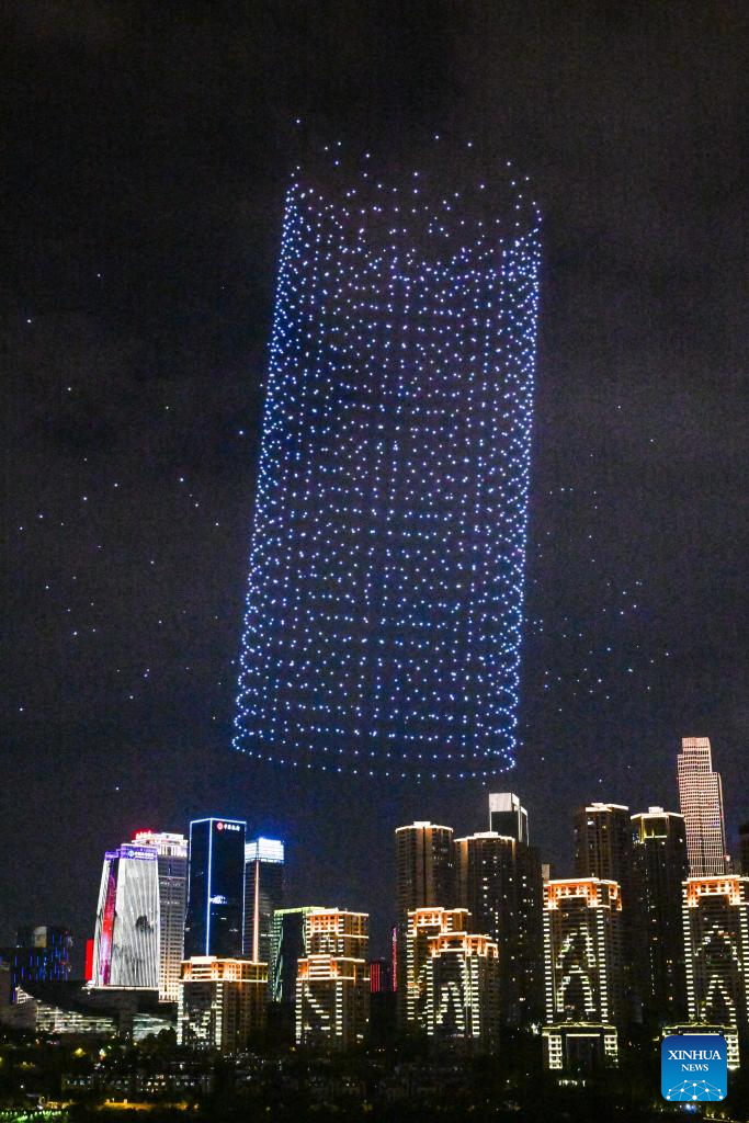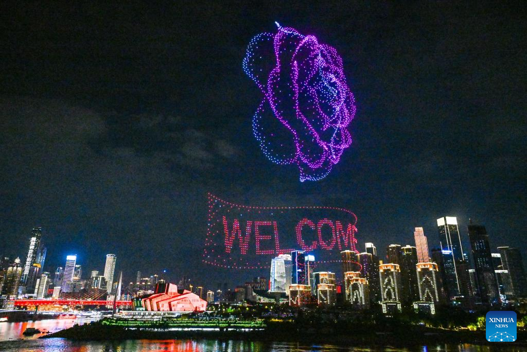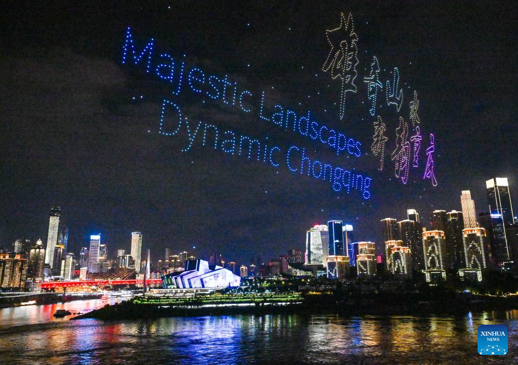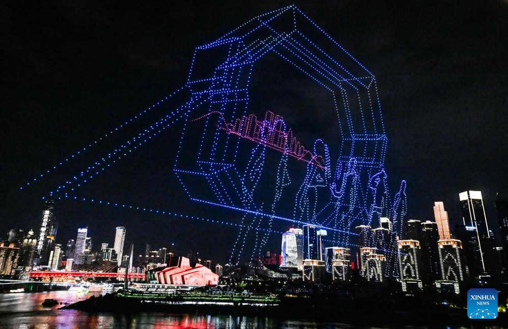A drone light show is staged in southwest China's Chongqing Municipality, Aug. 23, 2025. Under the night sky, Chongqing is ablaze with lights and full of charm. Since April 19 this year, in the evenings of every Saturday and important holidays, Chongqing has staged regular performances of drone light show to further boost the city's night economy. (Xinhua/Wang Quanchao)