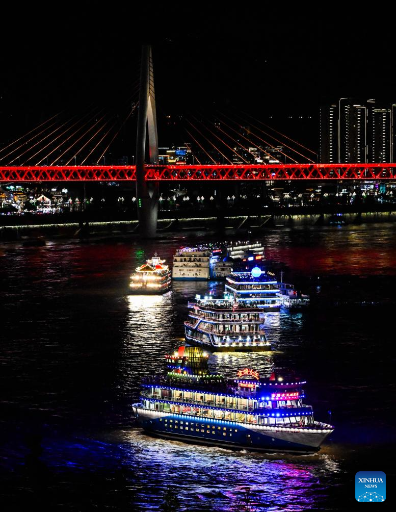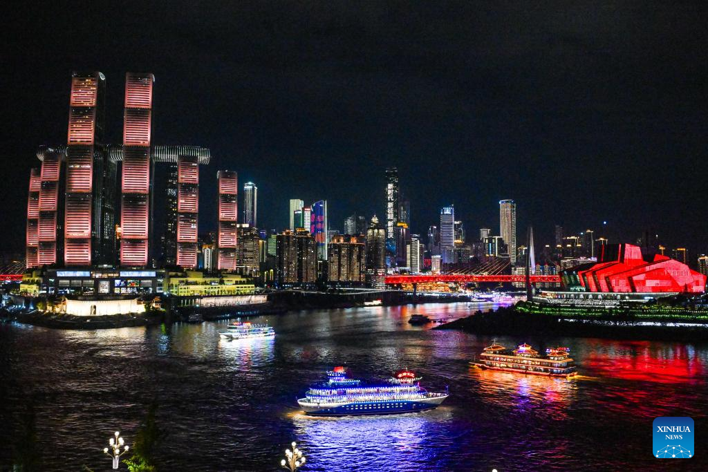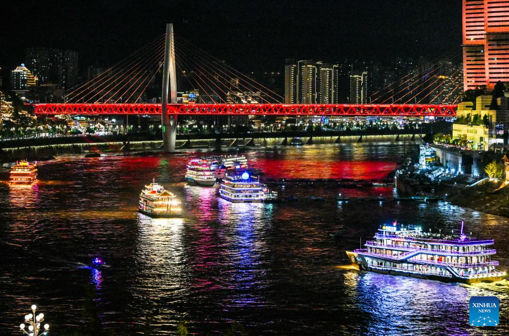 Tourists take boats to enjoy the night view in southwest China's Chongqing Municipality, Aug. 23, 2025. Under the night sky, Chongqing is ablaze with lights and full of charm. Since April 19 this year, in the evenings of every Saturday and important holidays, Chongqing has staged regular performances of drone light show to further boost the city's night economy. (Xinhua/Wang Quanchao)