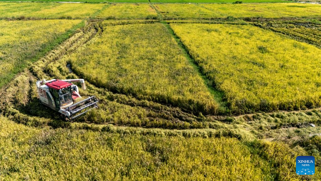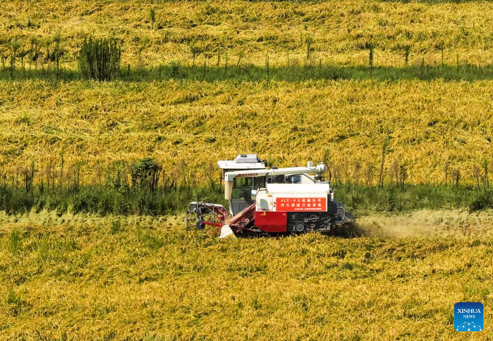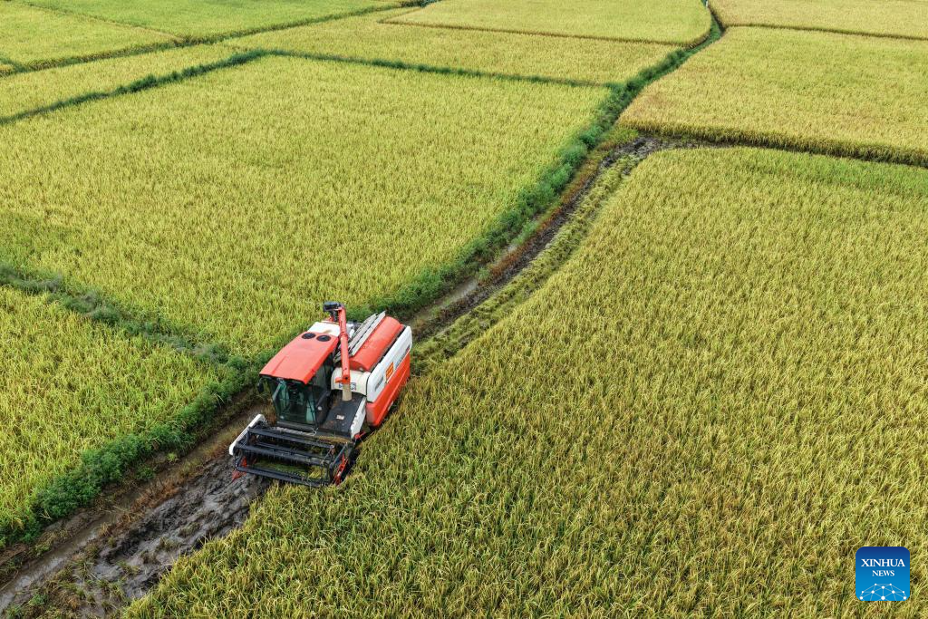 An aerial drone photo taken on Aug. 22, 2025 shows a reaper harvesting rice in a field in Jiaji Town of Qionghai City, south China's Hainan Province. As the Chushu of the solar terms is approaching, farmers across the country are busy working in fields. (Photo by Meng Zhongde/Xinhua)