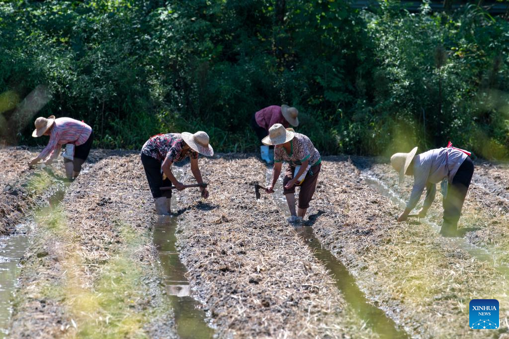 Farmers work in a field in Longhui County of Shaoyang City, central China's Hunan Province, Aug. 22, 2025. As the Chushu of the solar terms is approaching, farmers across the country are busy working in fields. (Photo by Zeng Yong/Xinhua)