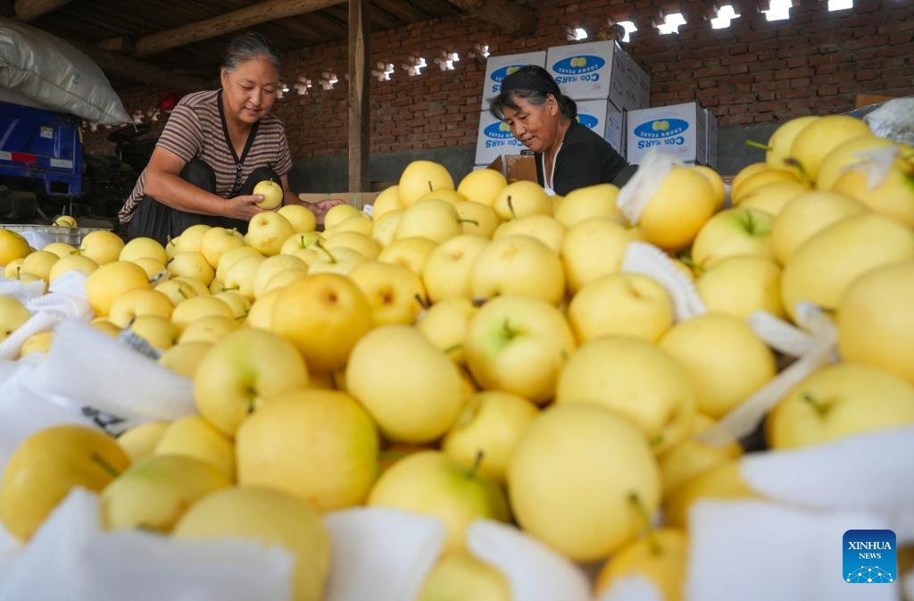 Farmers pack freshly-picked pears in Zhoujiazhuang Village of Jinzhou City, north China's Hebei Province, Aug. 22, 2025. As the Chushu of the solar terms is approaching, farmers across the country are busy working in fields. (Photo by Liang Zidong/Xinhua)