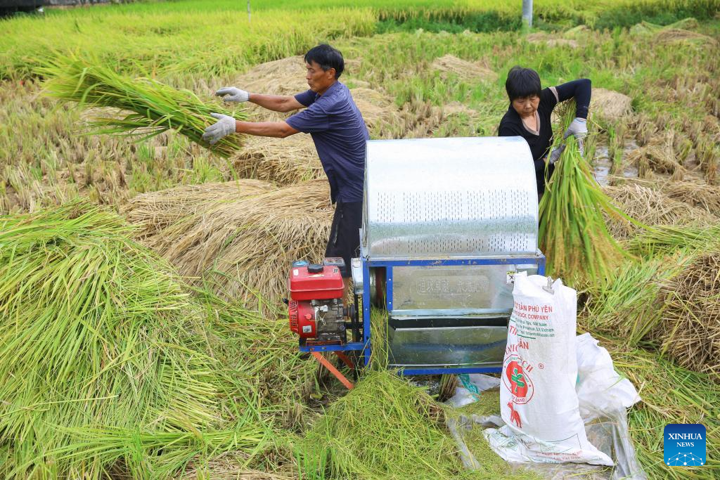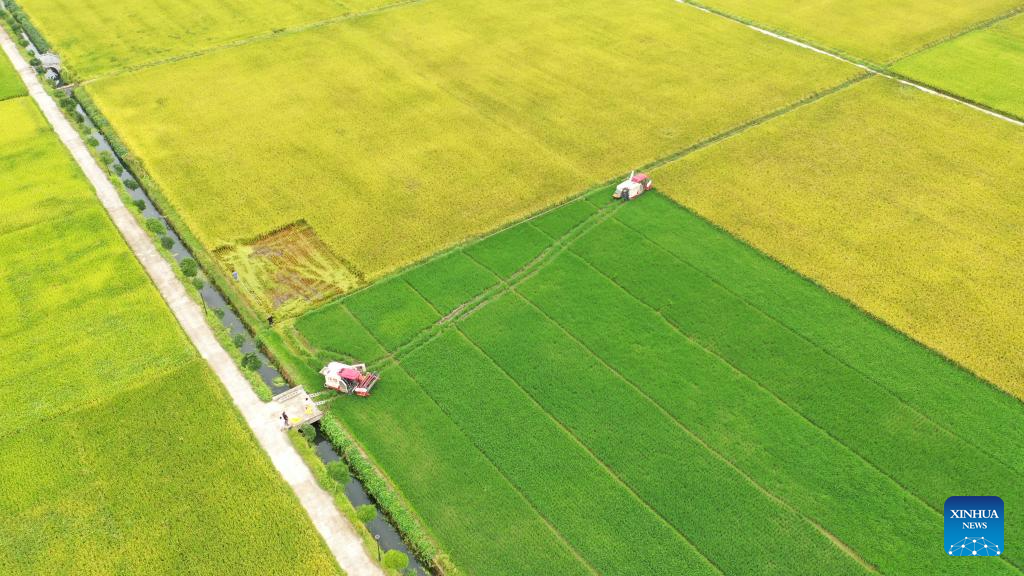 An aerial drone photo shows farmers operating harvesters in a field in Longhui County of Shaoyang City, central China's Hunan Province, Aug. 22, 2025. As the Chushu of the solar terms is approaching, farmers across the country are busy working in fields. (Photo by Zeng Yong/Xinhua)