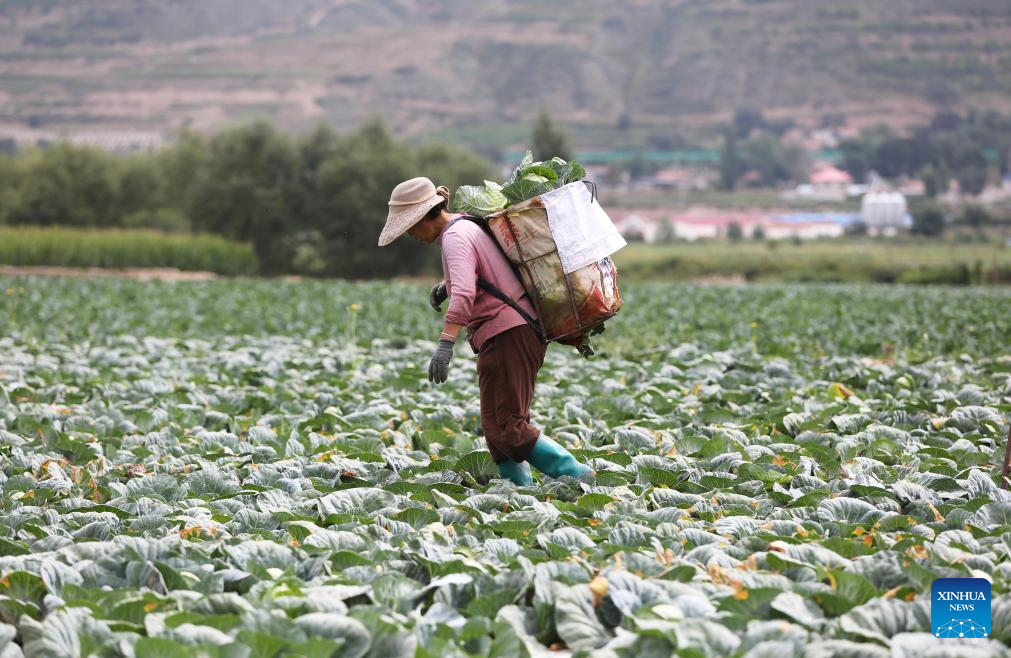 A farmer transports vegetable in a field in Anding District of Dingxi City, northwest China's Gansu Province, Aug, 22, 2025. As the Chushu of the solar terms is approaching, farmers across the country are busy working in fields. (Photo by Wang Kexian/Xinhua)