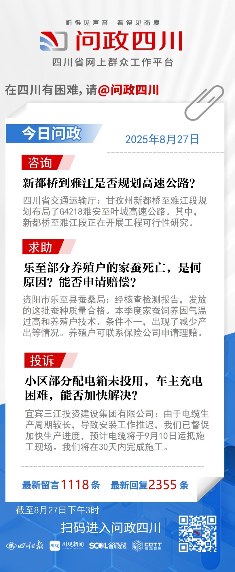 在四川有困難,找問政四川。如果您在四川遇到了操心事、煩心事、揪心事,請登錄“四川省網上群眾工作平臺—問政四川”或撥打問政四川熱線(028-96001)留言反映、求助或建議。我們將充分發揮平臺的互動聯系作用及輿論監督功能,第一時間傳遞民聲,推動問題得以及時解決——聽得見聲音,看得見態度。