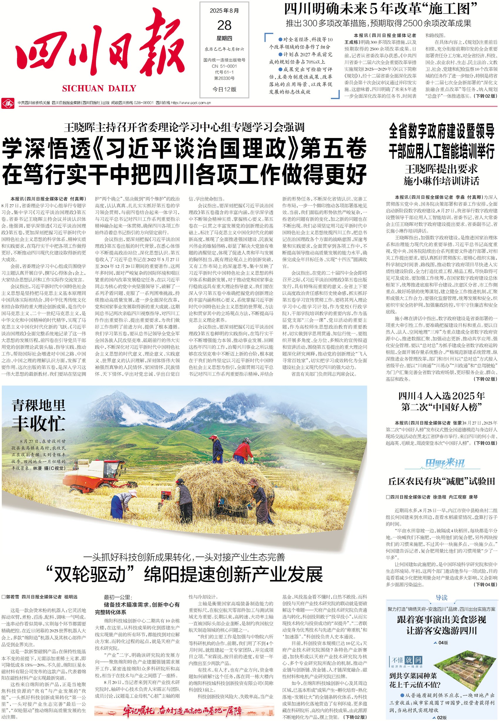 明確300多項改革措施,預期取得2500余項改革成果……日前,《中共四川省委十二屆六次全會重要改革舉措實施規劃(2025—2029年)》印發實施,四川明確了未來5年進一步全面深化改革的任務書、時間表和路線圖。詳情請看今日一版。