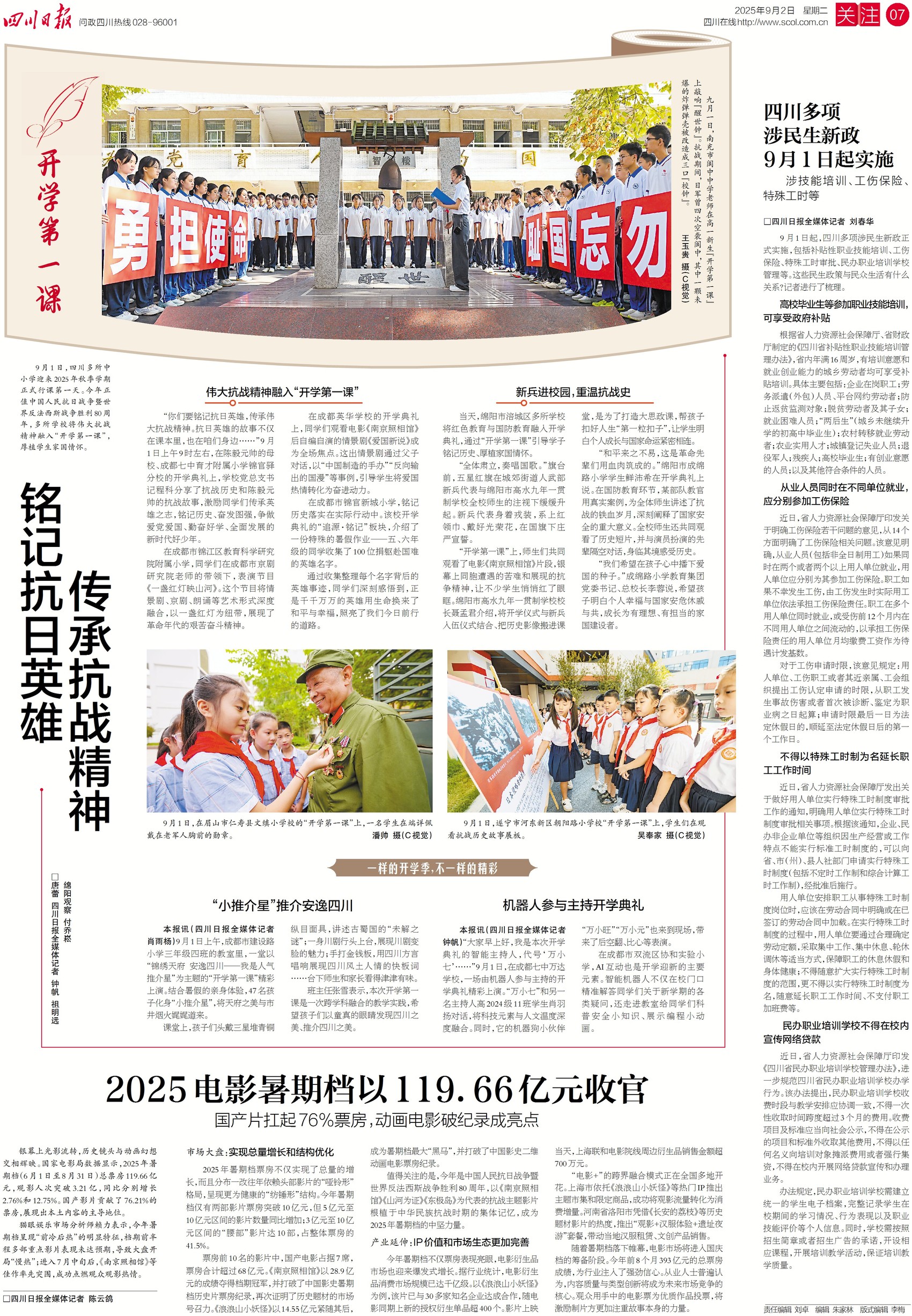 昨日,四川多所中小學(xué)正式開(kāi)學(xué)。今年正值中國(guó)人民抗日戰(zhàn)爭(zhēng)暨世界反法西斯戰(zhàn)爭(zhēng)勝利80周年,各學(xué)校將偉大抗戰(zhàn)精神融入“開(kāi)學(xué)第一課”,引導(dǎo)學(xué)生銘記抗戰(zhàn)歷史,厚植家國(guó)情懷。在陳毅元帥的母校,師生一起聆聽(tīng)抗戰(zhàn)故事;在綿陽(yáng)多所學(xué)校,新兵代表與師生共同升旗宣誓……關(guān)注今日七版,一起上一堂特殊的“開(kāi)學(xué)第一課”。