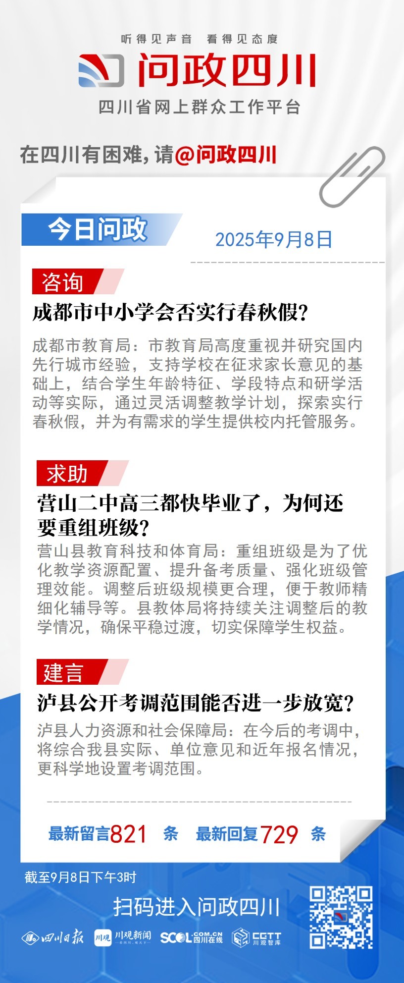 成都市教育局回復:市教育局高度重視并研究國內先行城市經驗,支持學校在征求家長意見的基礎上,結合學生年齡特征、學段特點和研學活動等實際,通過靈活調整教學計劃,探索實行春秋假,并為有需求的學生提供校內托管服務。