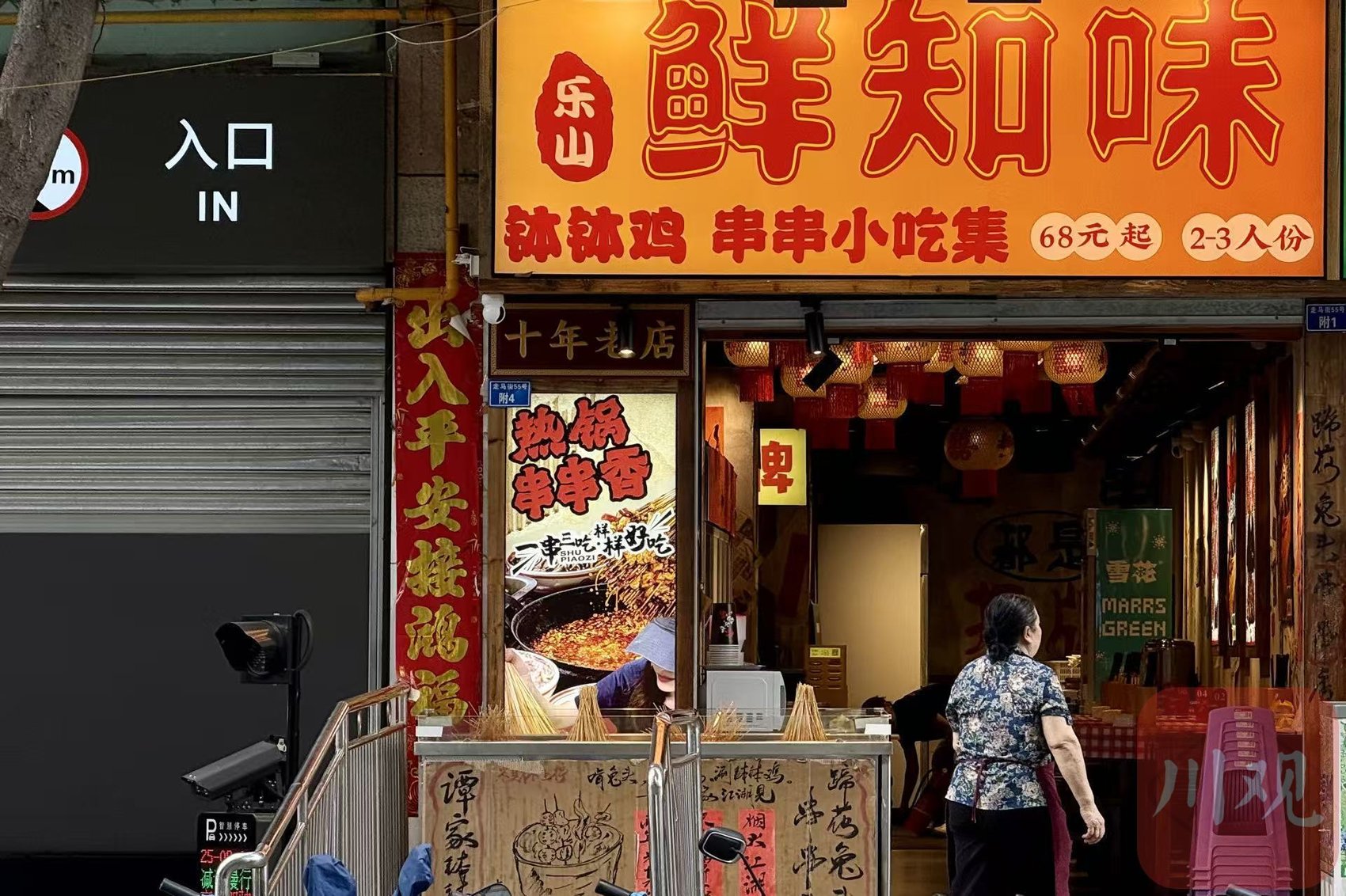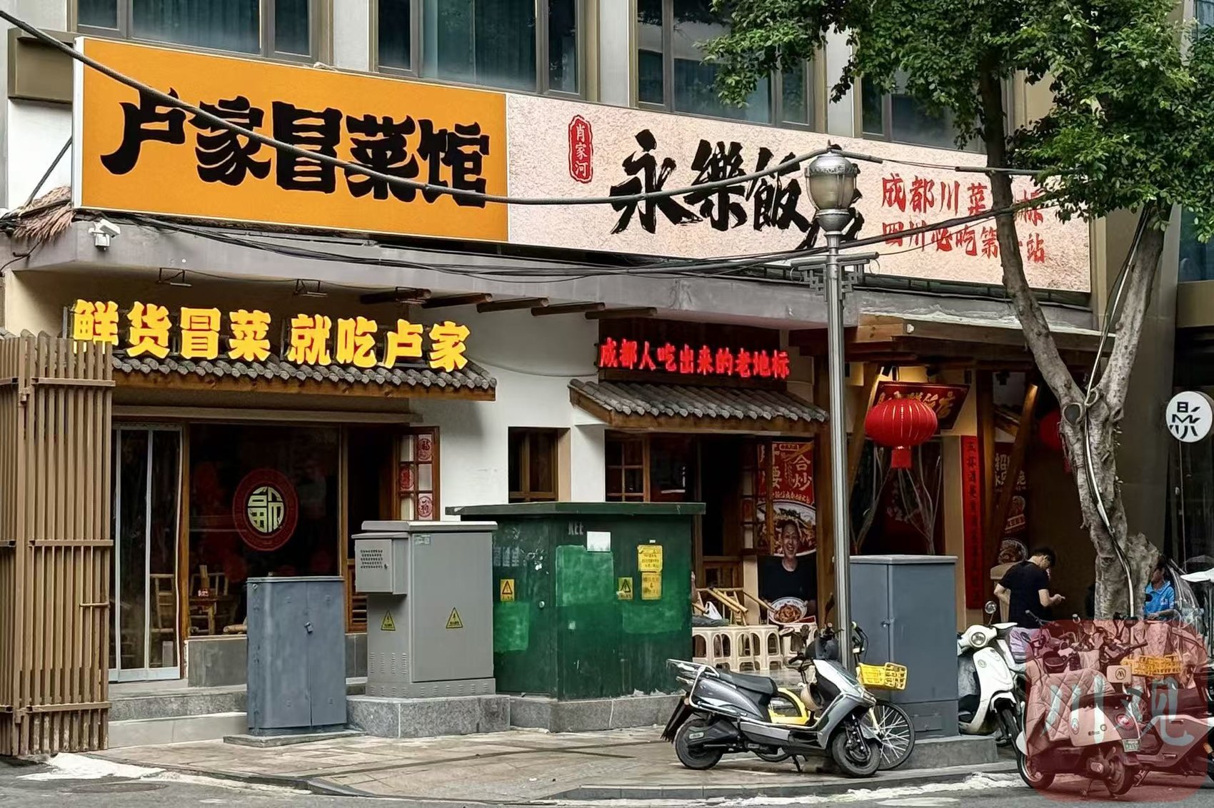 記者在該店所在的走馬街留意到,附近商鋪還有成都知名“蒼蠅館子”——“樂山鮮知味”的新店,其門口灶臺外立面上標有疑似成都米其林入選餐廳“譚家”的同名缽缽雞宣傳。