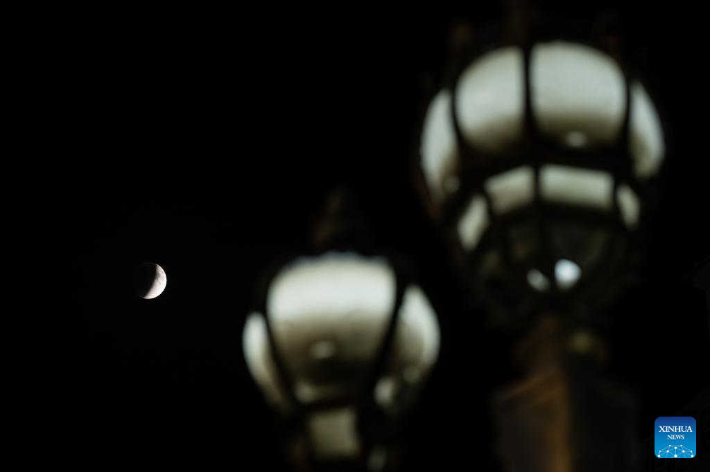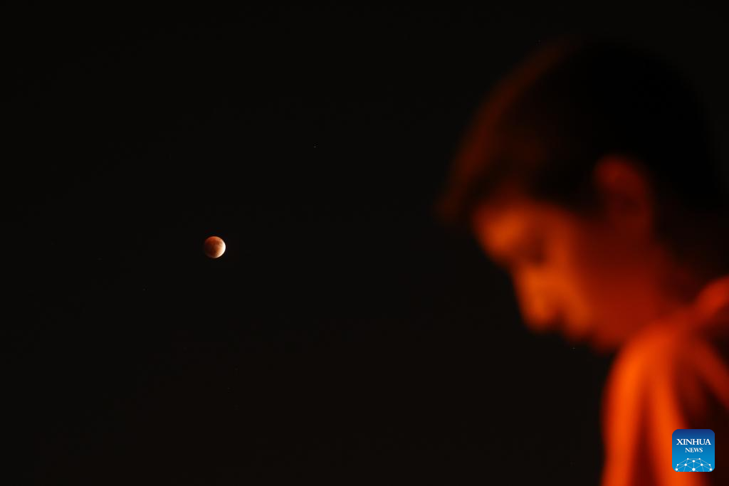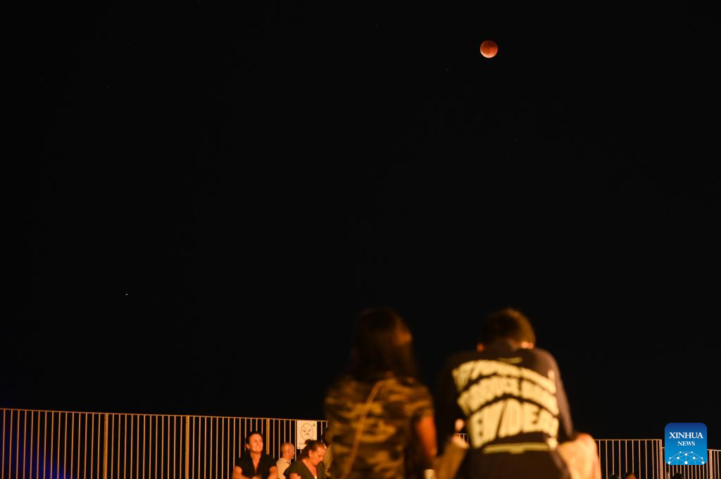 A lunar eclipse is observed in Nicosia, Cyprus, Sept. 7, 2025. (Photo by George Christophorou/Xinhua)