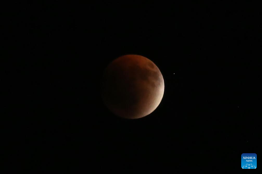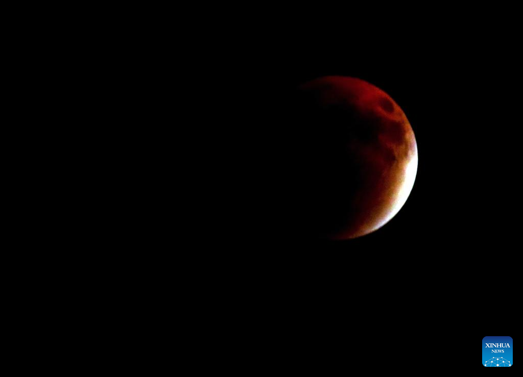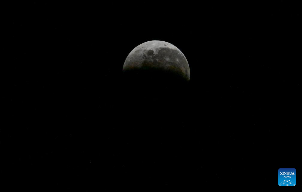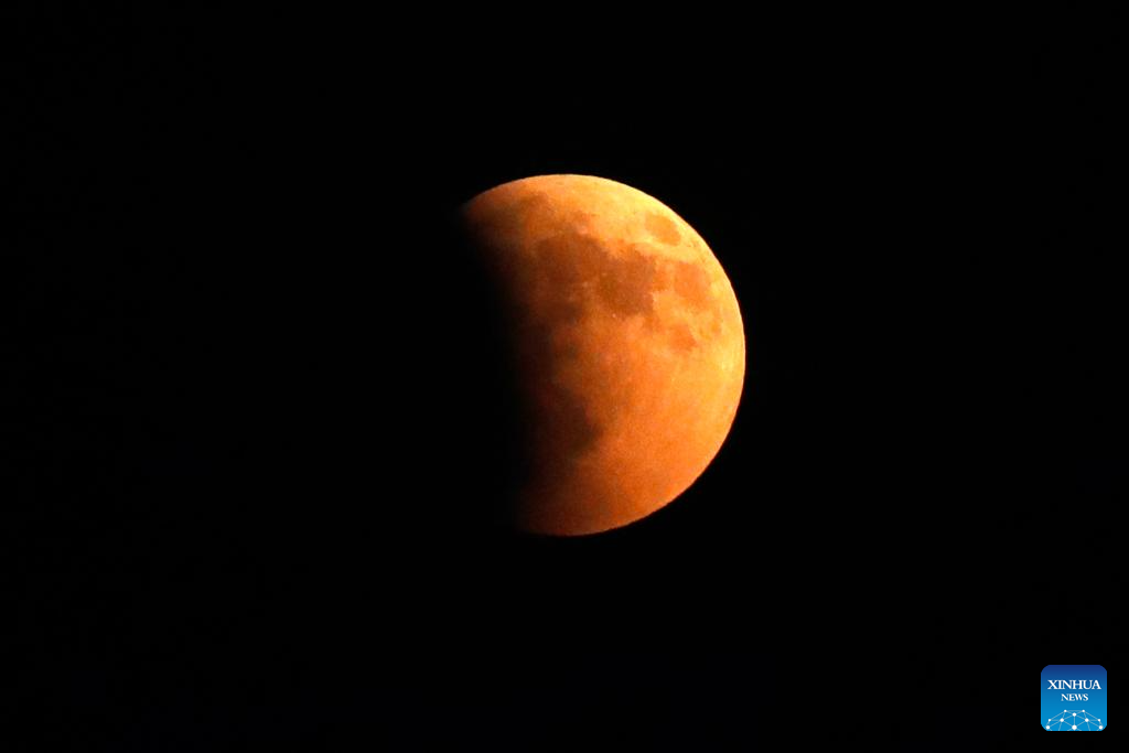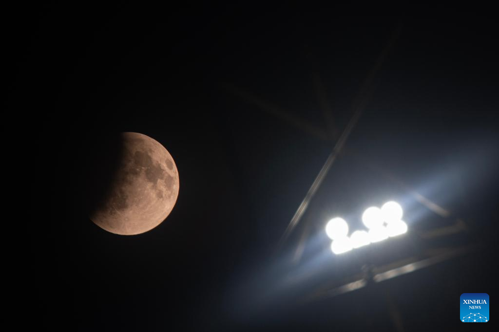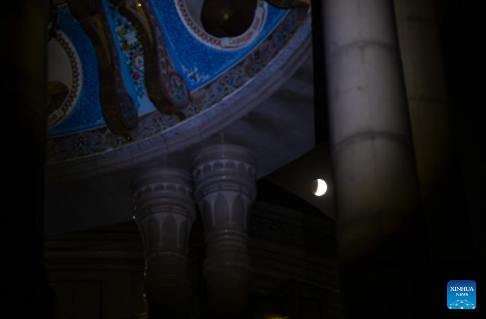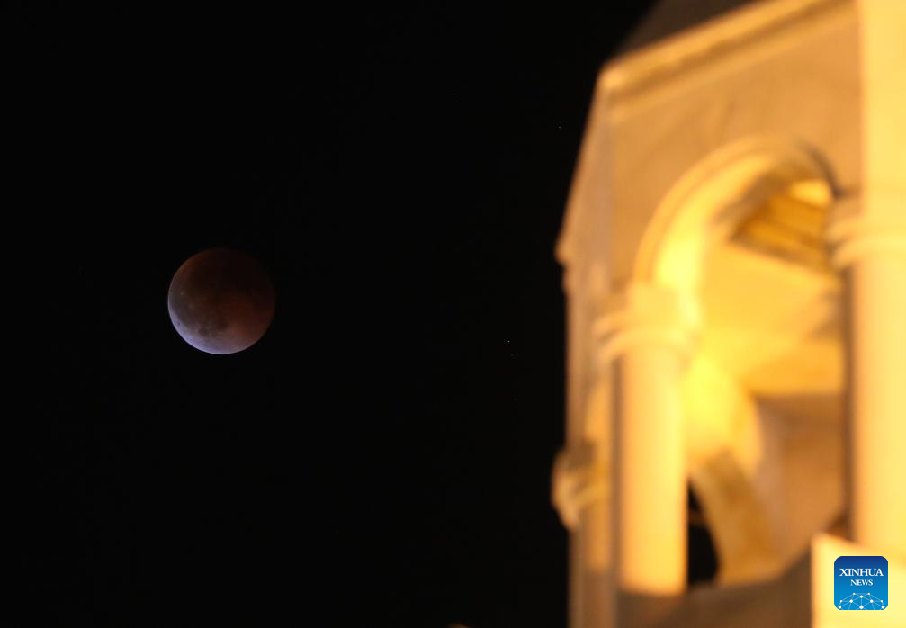 This photo taken on Sept. 7, 2025 shows a view of lunar eclipse in Riyadh, Saudi Arabia. (Xinhua/Wang Haizhou)