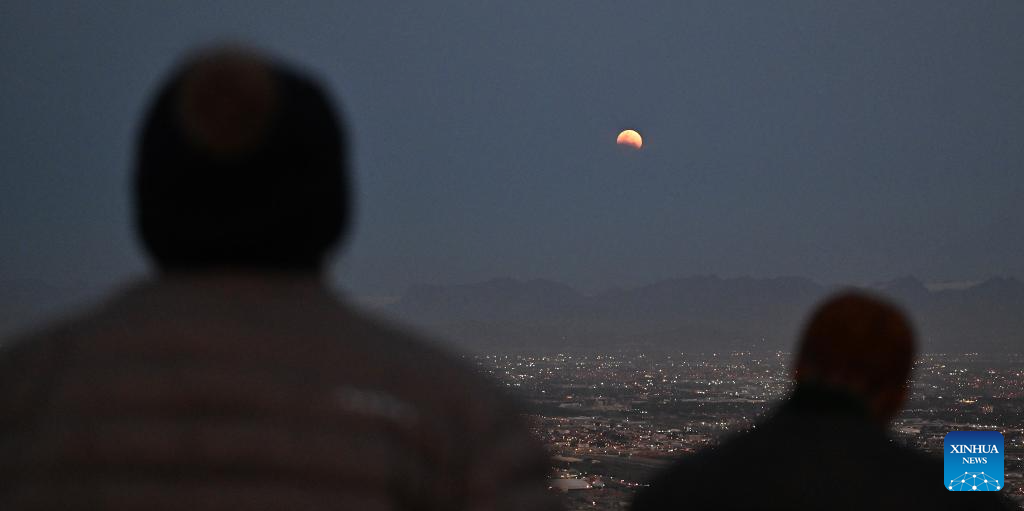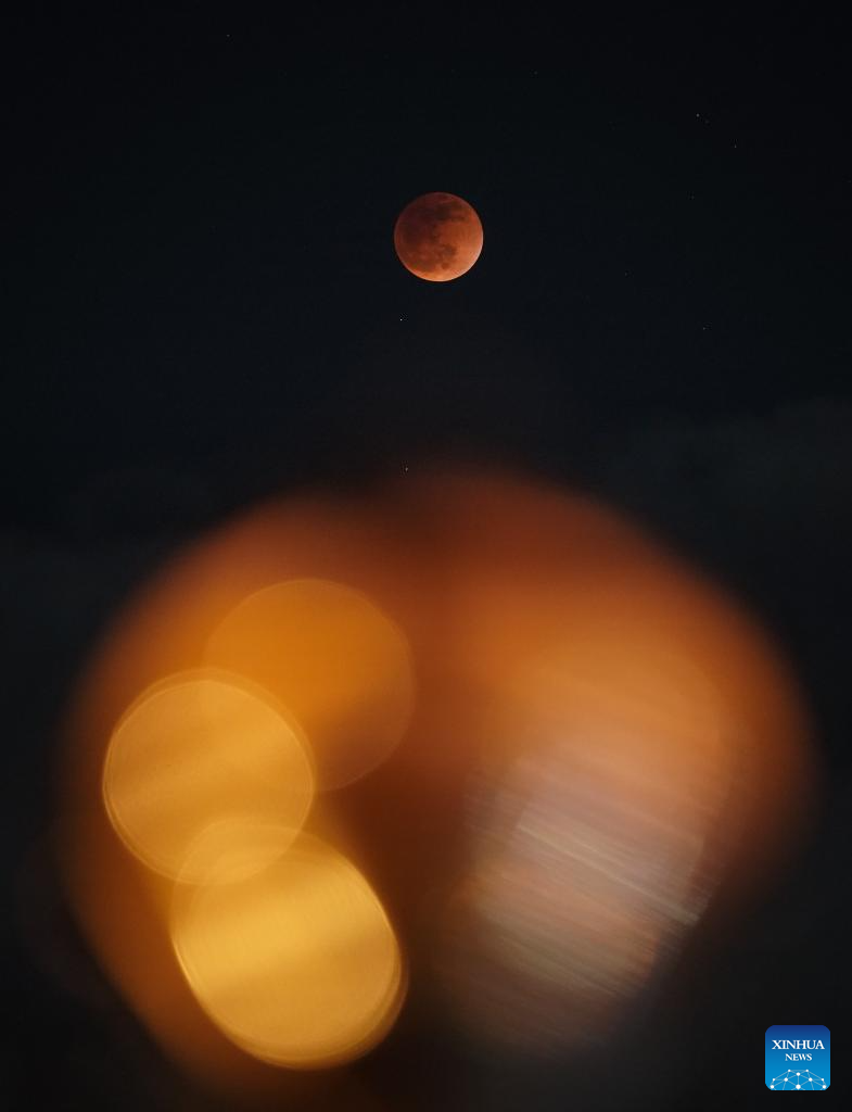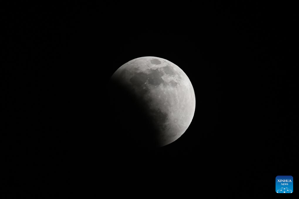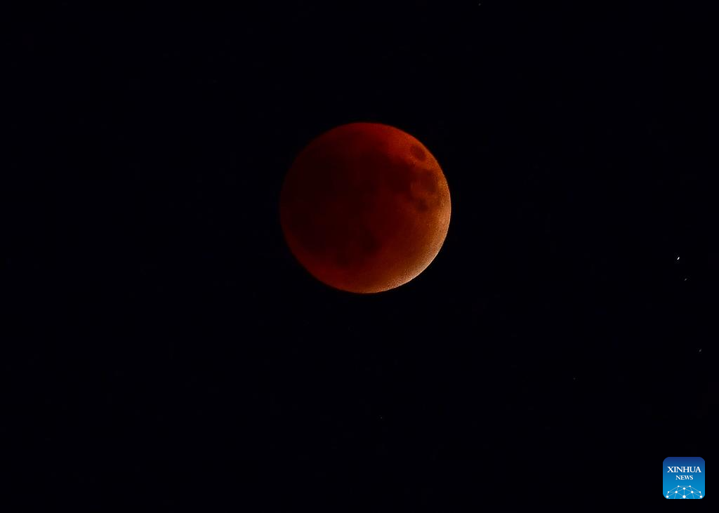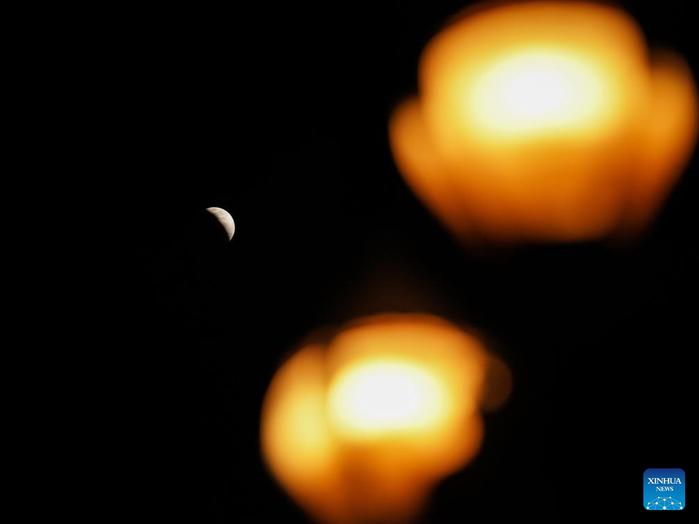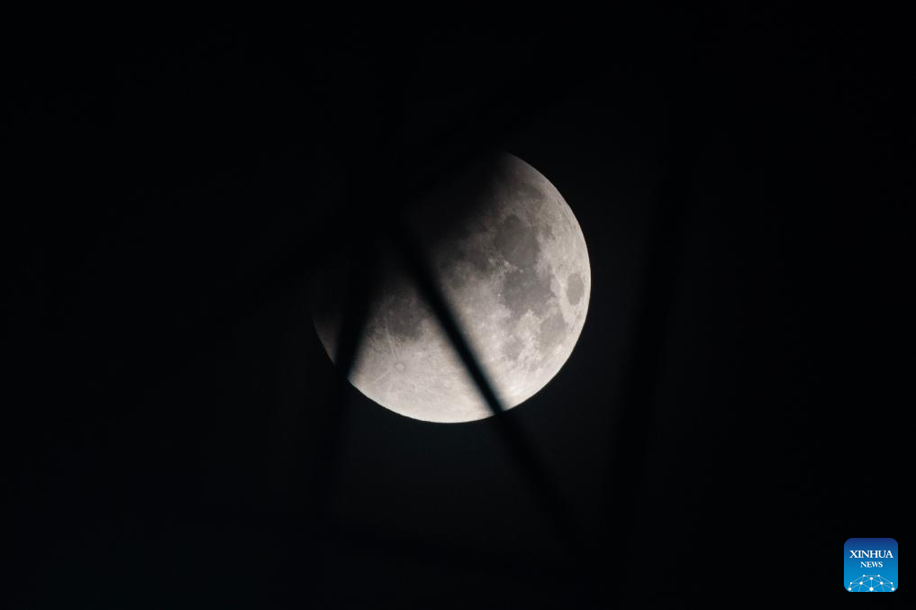 This photo taken on Sept. 7, 2025 shows a view of lunar eclipse in Riyadh, Saudi Arabia. (Xinhua/Wang Haizhou)