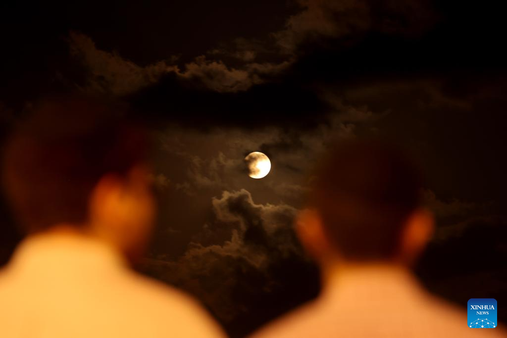People watch the moon during a total lunar eclipse in the sky over Cairo, Egypt, Sept. 7, 2025. (Xinhua/Ahmed Gomaa)