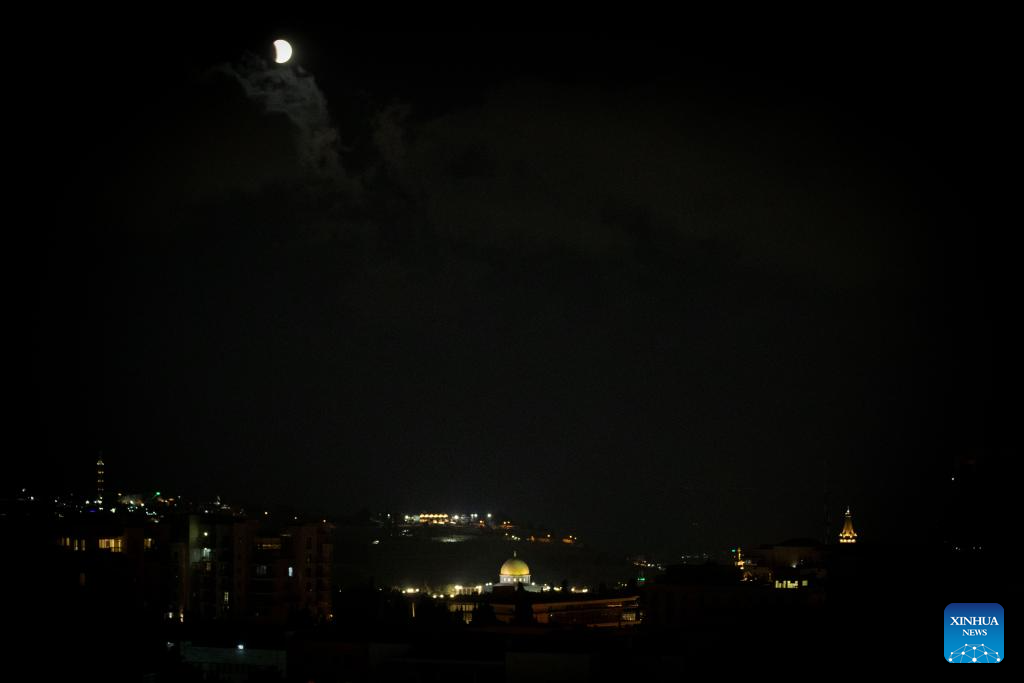 The moon is seen during a lunar eclipse over the Old City of Jerusalem on Sept. 7, 2025. (Xinhua/Chen Junqing)