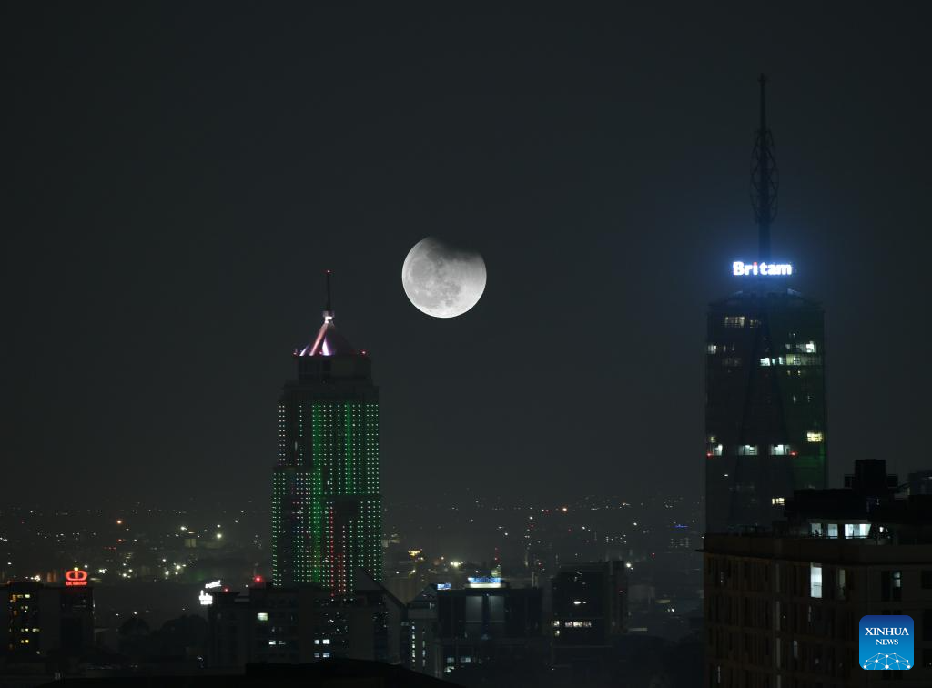 This photo taken on Sept. 8, 2025 shows a view of lunar eclipse in the sky over Jakarta, Indonesia. (Xinhua/Zulkarnain)