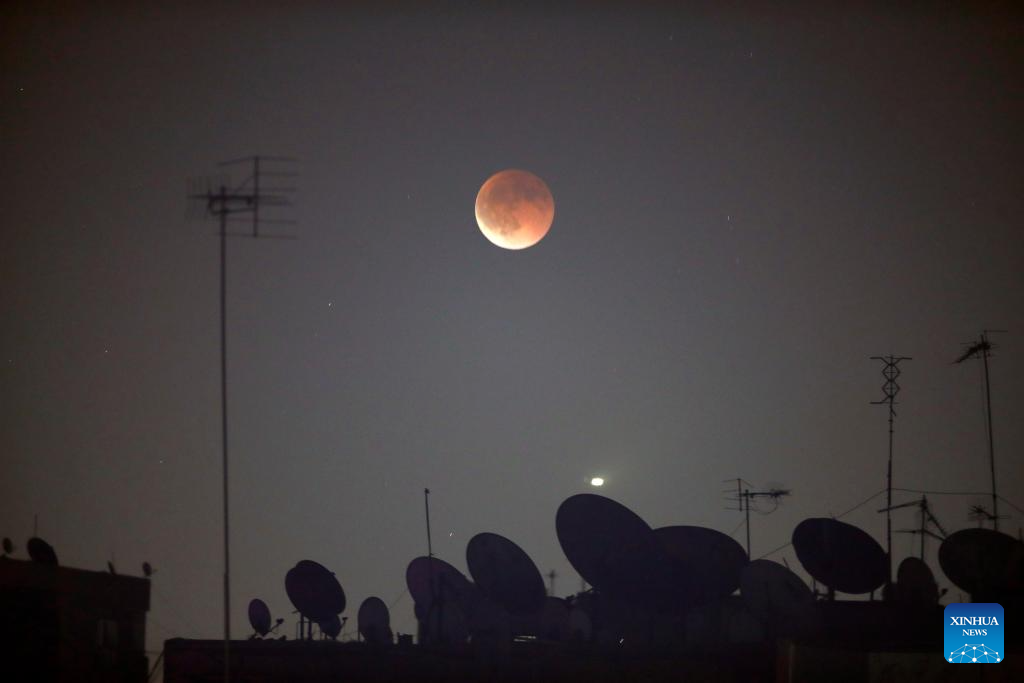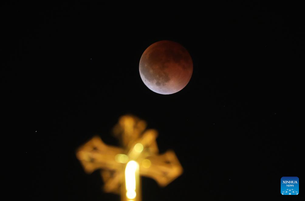 This photo taken on Sept. 7, 2025 shows a view of lunar eclipse in the sky over Bethlehem, the southern West Bank. (Photo by Mamoun Wazwaz/Xinhua)