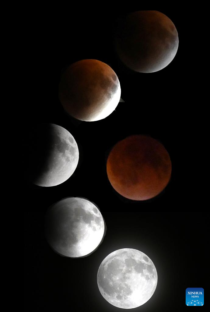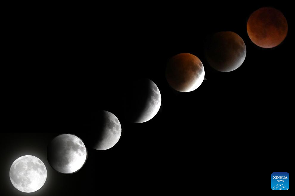 This combo photo taken on Sept. 7, 2025 shows the process of a total lunar eclipse in the sky over Cairo, Egypt. (Xinhua/Ahmed Gomaa)