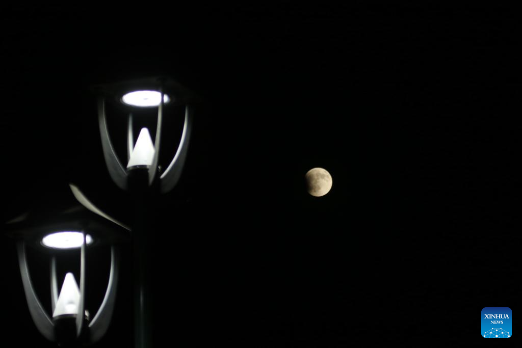 This photo taken on Sept. 7, 2025 shows a view of lunar eclipse in Khartoum, Sudan. (Photo by Mohamed Khidir/Xinhua)